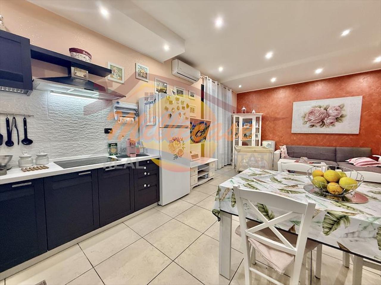 composizione interna: Ingresso su ampia zona living open space con cucina a vista e con uscita sul balcone con una veranda chiusa a vetri con lavanderia/ripostiglio, piccolo corridoio, Camera principale, cameretta e ampio bagno con doccia.