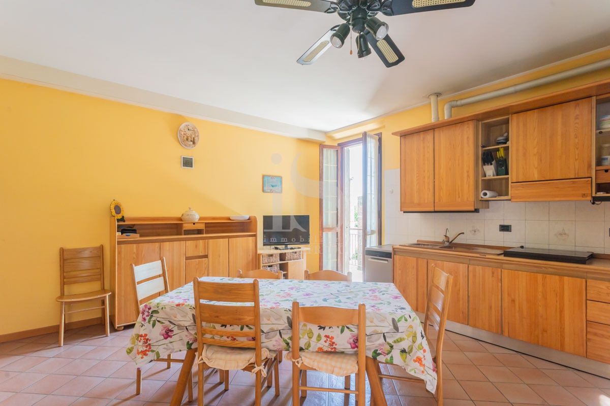 - Primo piano - zona giorno e notte . Ingresso su soggiorno di 45 mq con affaccio a sud e caminetto a pellet canalizzato . Cucina abitabile di 27 mq, luminosa, con esposizione ovest e sud. . Due camere da letto: una matrimoniale di 17 mq e una cameretta di 10 mq . Due bagni: uno finestrato con doccia e uno padronale con vasca . Balcone panoramico di 13 mq - Secondo piano - sottotetto . Locale di 20 mq . Ampio open space di 35 mq ideale come soggiorno/studio/hobby room . Ambiente di 10 mq . Altezze mansardate da 1,60 m a 2,70 m . Accesso tramite scala in muratura interna - Comfort, efficienza energetica e possibilità edificatoria L'appartamento è dotato di impianto fotovoltaico (22 pannelli) con produzione autonoma, camino canalizzato a pellet, doppi vetri in legno con zanzariere, sistema tetto ISOTEC e aria condizionata al piano superiore.