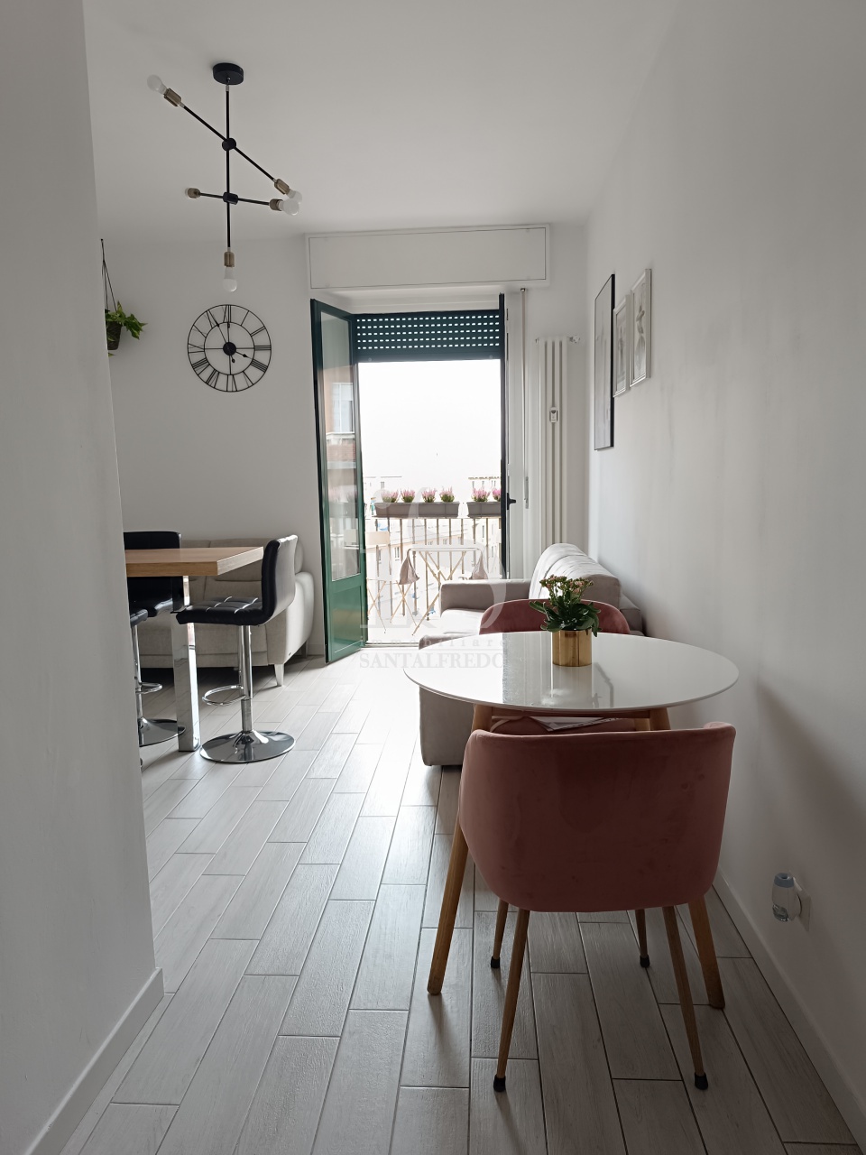 La zona giorno è accogliente e moderna, con cucina su misura con penisola e accesso diretto al balcone.