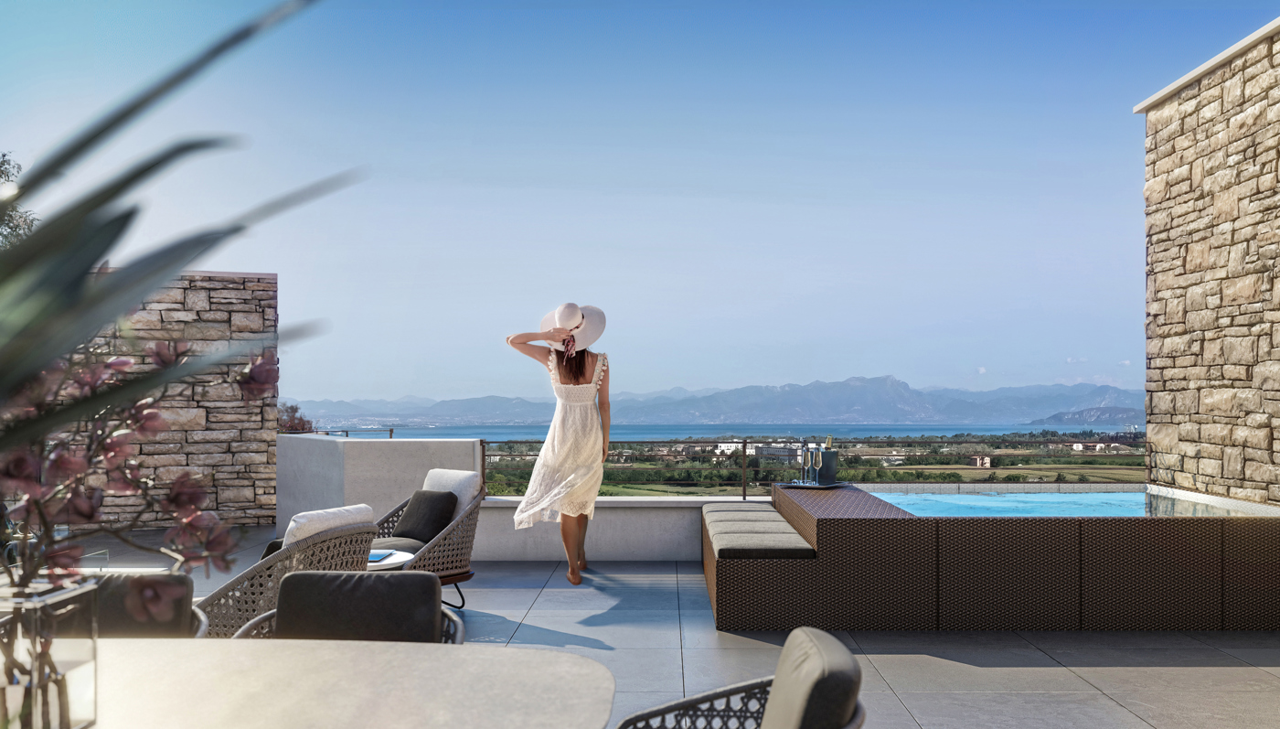 Soluzione immobiliare al piano primo con sundeck privato al piano secondo, vista lago spettacolare, di: Ingresso, zona living con cucina, 2 camere, doppi servizi, terrazzo, sundeck privato con pergola fotovoltaica e mini piscina, box auto, posto auto, cantina, vista lago. Consegna maggio 2027. Dal fascino del passato un progetto contemporaneo premiato come miglior progetto italiano, un luogo ideale dell'abitare.