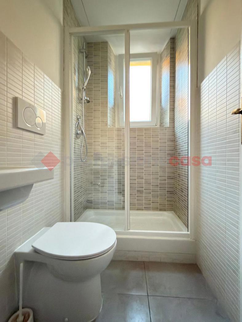 Il servizio in condivisione, cos come la sala dattesa e il corridoio, dotato di sedie per lattesa dei clienti.