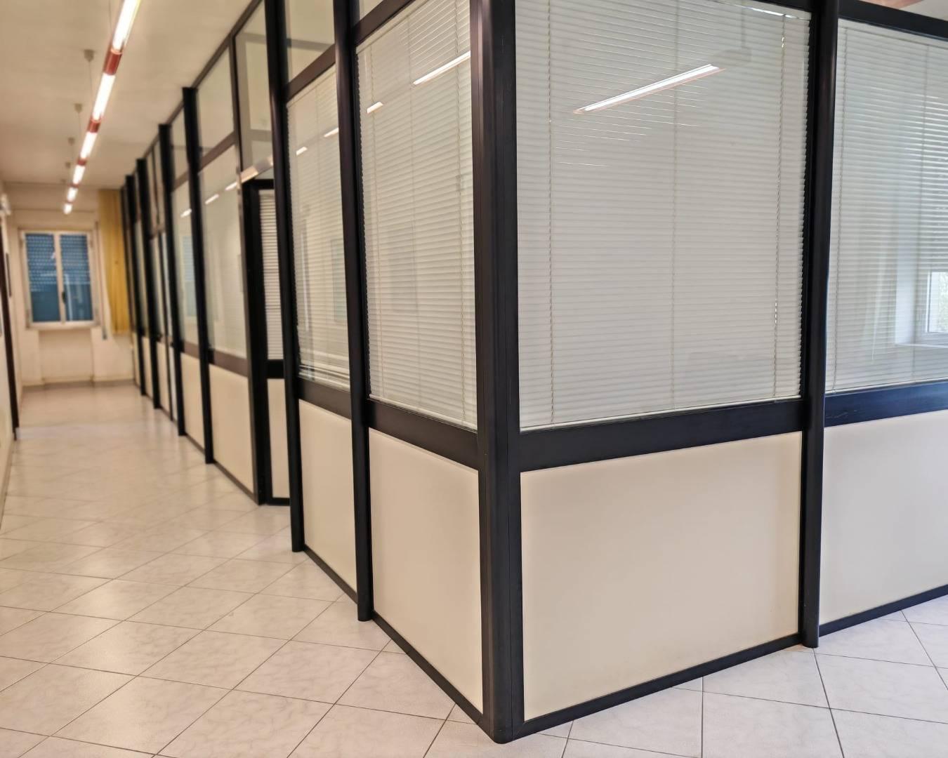 Finiture: Ambienti pronti all'uso con pareti divisorie mobili (vetrate con veneziane integrate) che permettono di rimodulare gli spazi secondo le esigenze del conduttore.