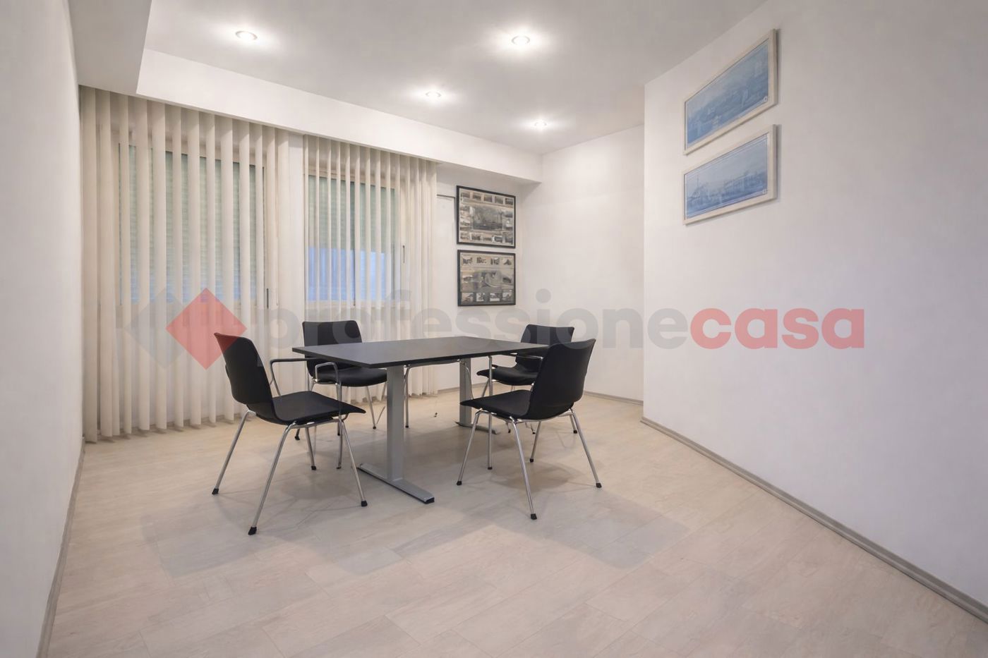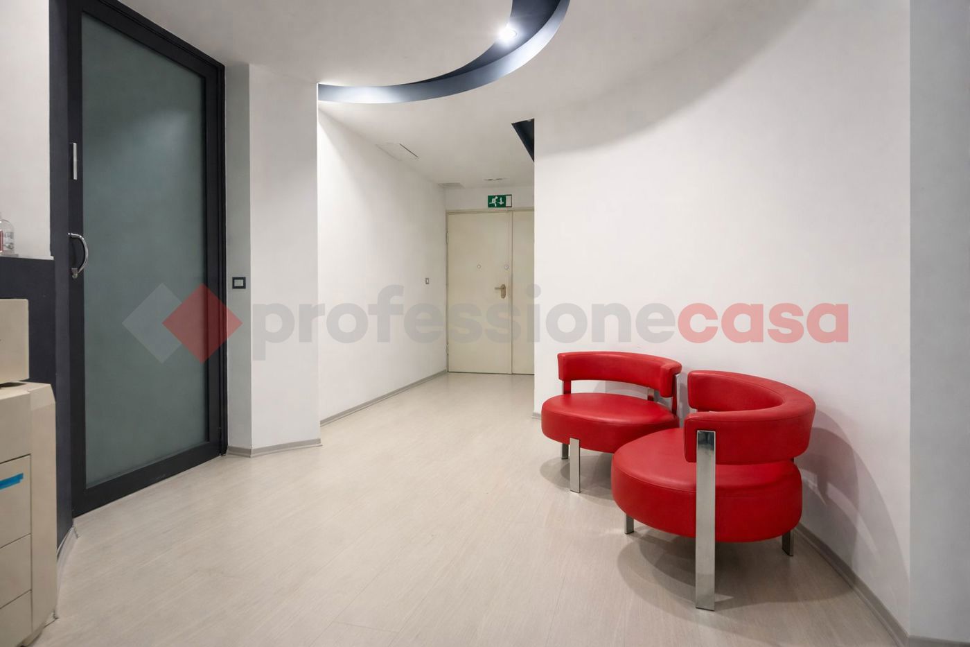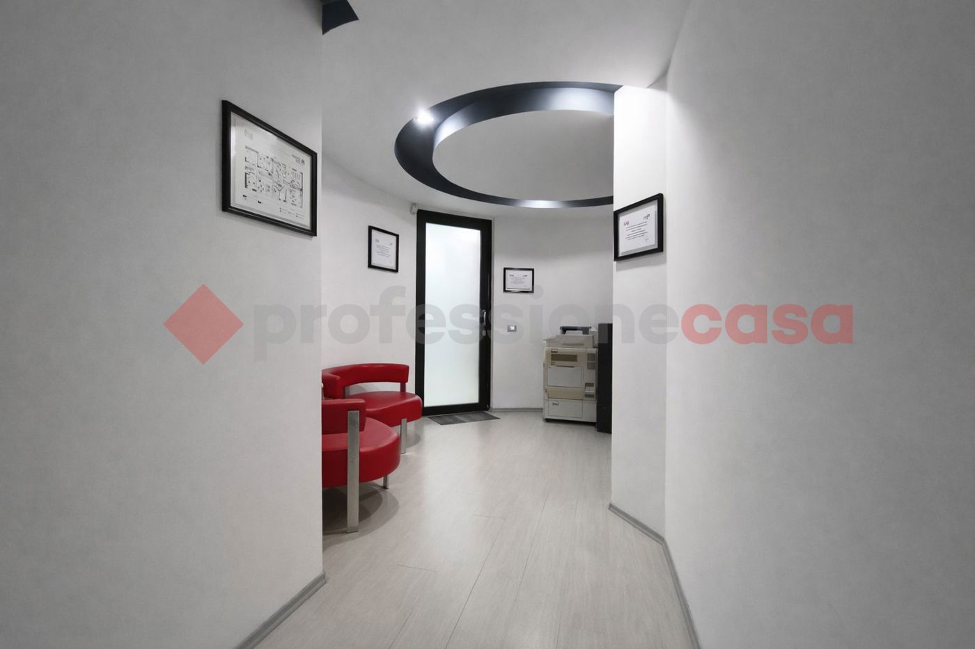 L'ingresso si apre su una comoda sala di attesa, a cui seguono quattro uffici indipendenti (non arredati) sala riunioni, locale tecnico e doppi servizi igienici.