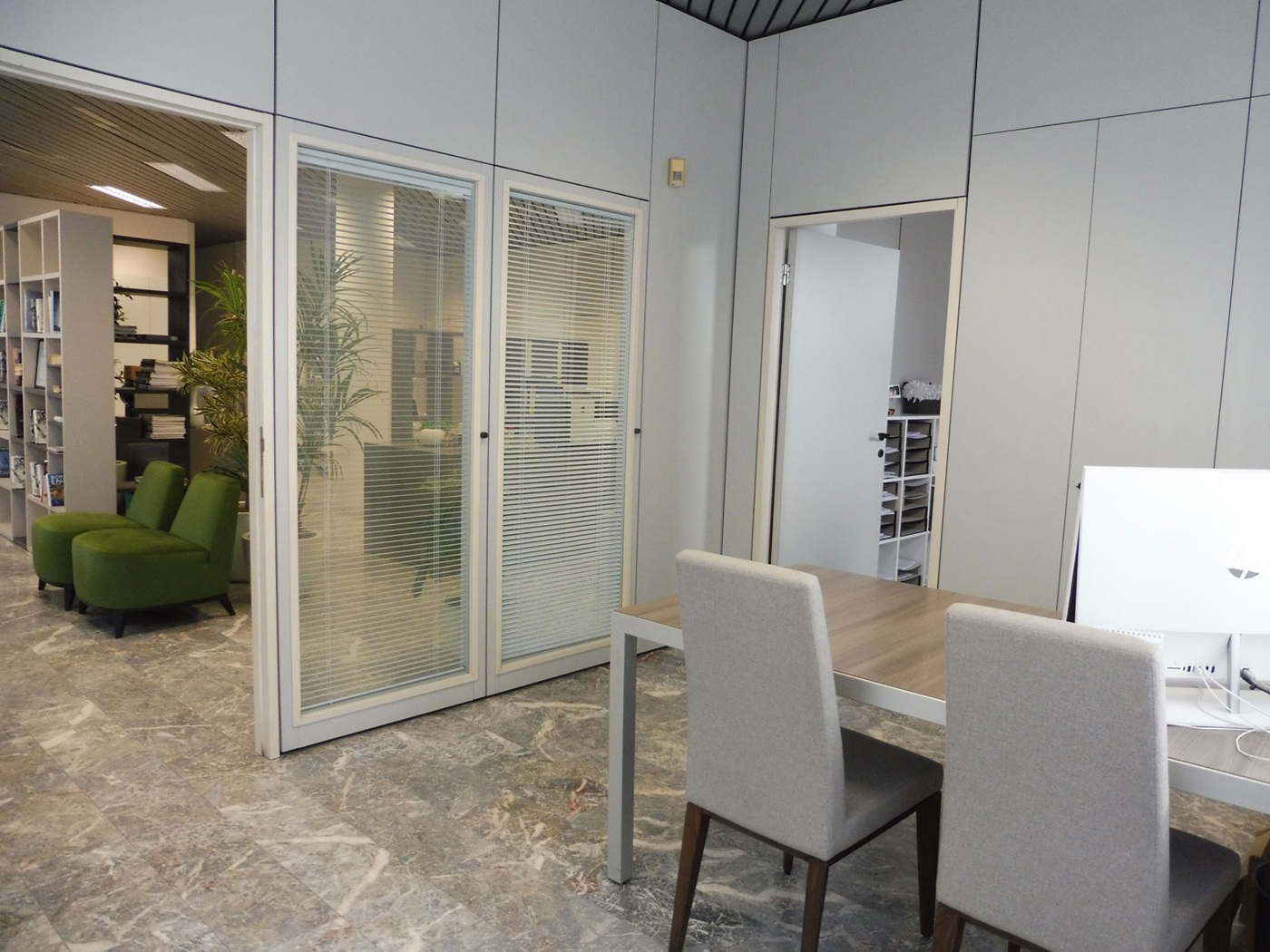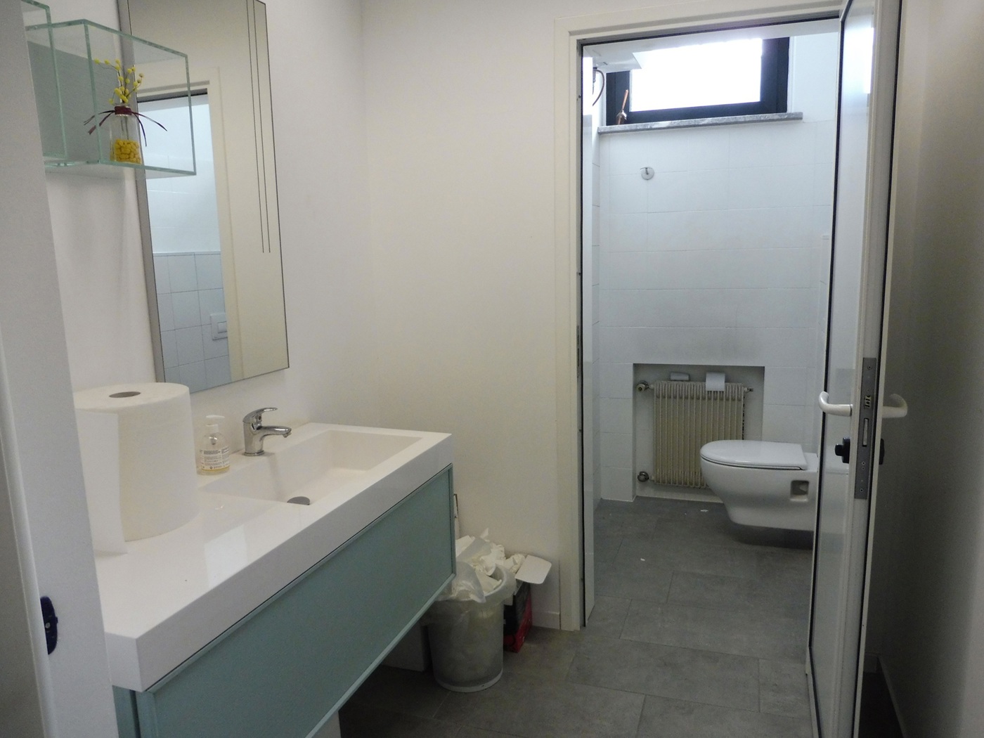Ingresso su ampio open space con due uffici separati e bagno.