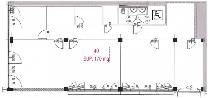 Lufficio può essere personalizzato secondo le proprie esigenze (vedi planimetria esemplificativa) e dispone di 2 bagni.