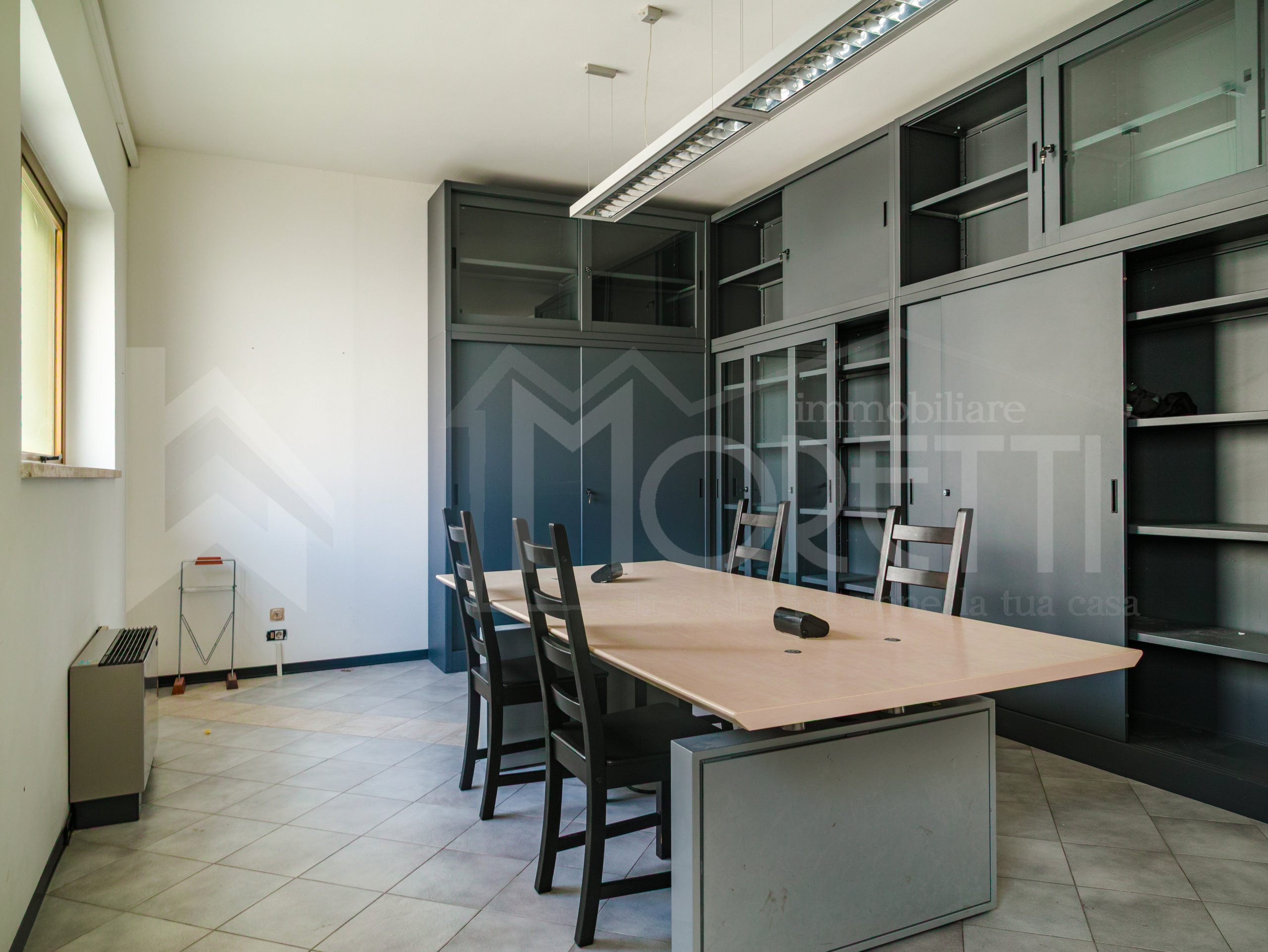 Lufficio, posto al primo piano, ha una superficie di circa 24 mq ed è arredato con un elegante tavolo riunioni dotato di prese elettriche integrate e con un ampio armadio attrezzato a scaffalatura che valorizza e organizza gli spazi.