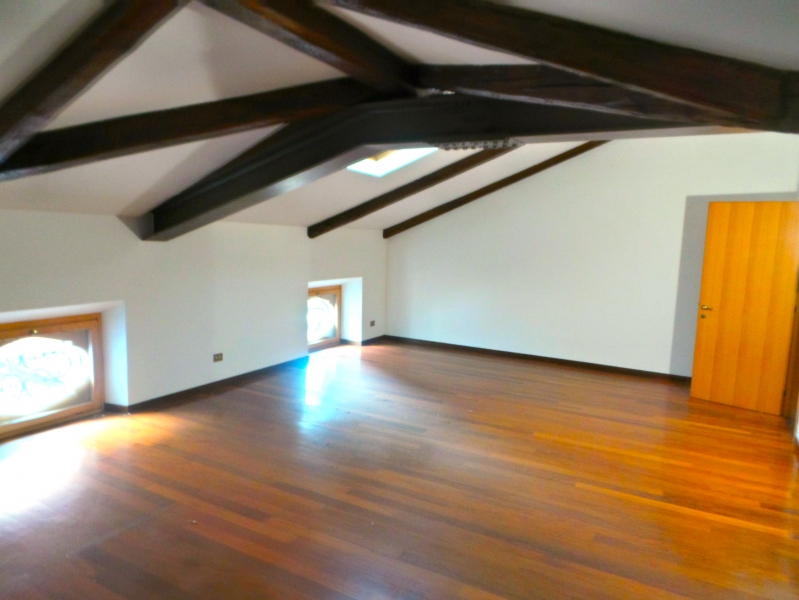 Finiture di pregio con parquet, soffitto mansardato e travi a vista.