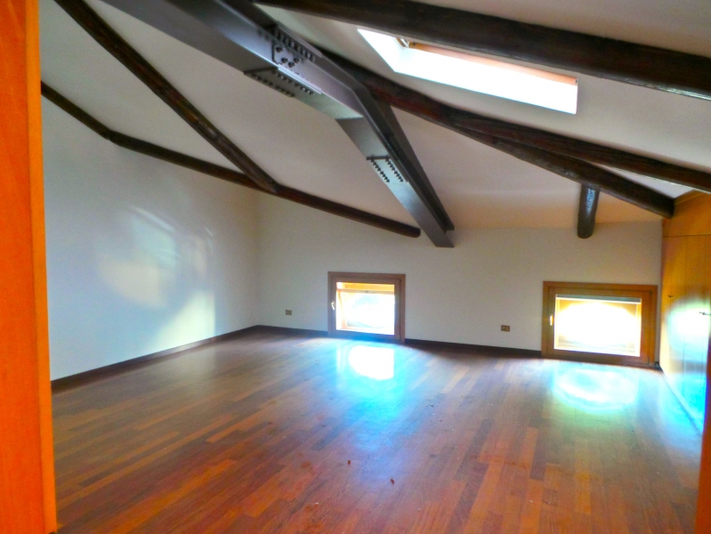 Finiture di pregio con parquet, soffitto mansardato e travi a vista.
