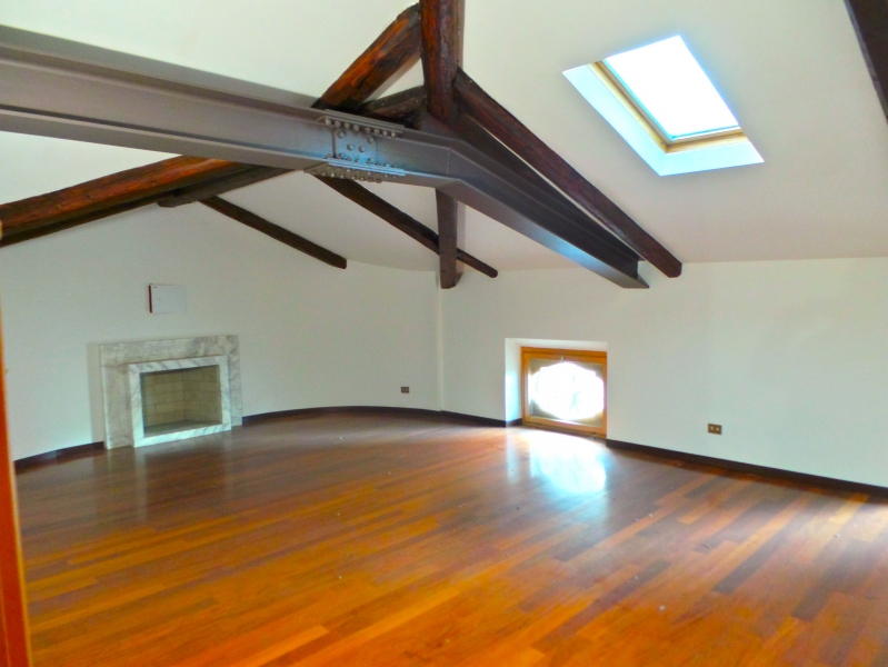 Finiture di pregio con parquet, soffitto mansardato e travi a vista.