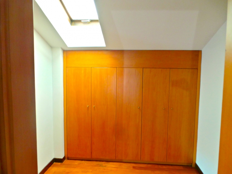 Finiture di pregio con parquet, soffitto mansardato e travi a vista.