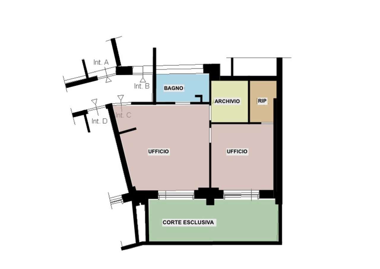 Al piano terra, i suoi 80 mq sono distribuiti in maniera intelligente: due ampi vani, un archivio/sala ced e un bagno raffinato.