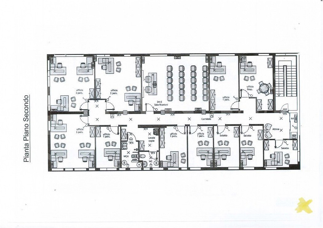 E' presente all'ingresso dei locali una reception di mq. 25 circa , dalla quale si raggiungono gli uffici al piano superiore.