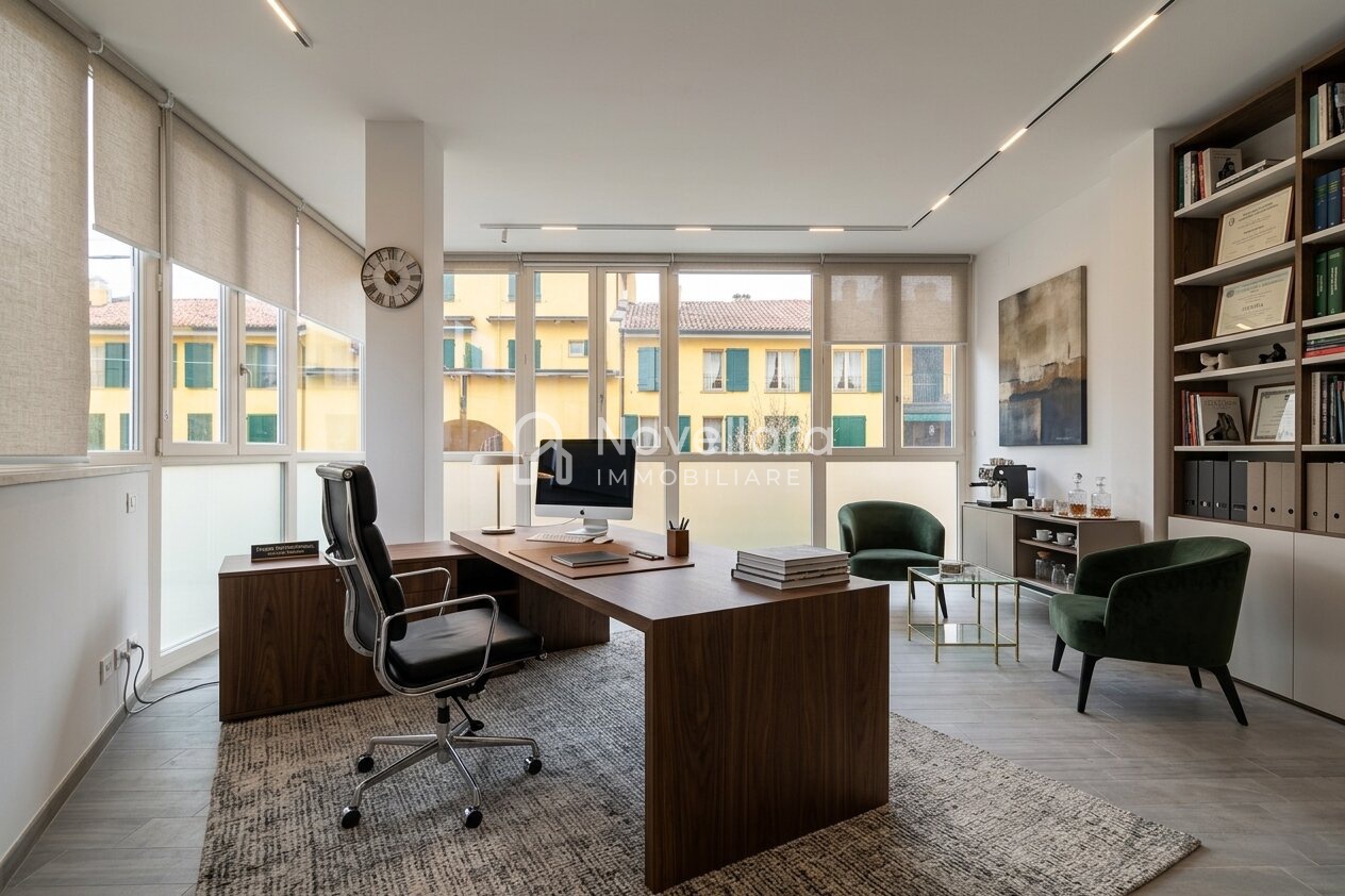 L'ufficio si presenta molto luminoso grazie alla splendide vetrate a tutta altezza che circondano l'intero perimetro della proprietà, donando una bellissima vista sul Borgonuovo e sulla piazza.