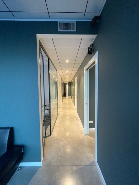 Gli spazi sono organizzati con pareti in vetro, impianto di climatizzazione caldo/freddo, e tende oscuranti.