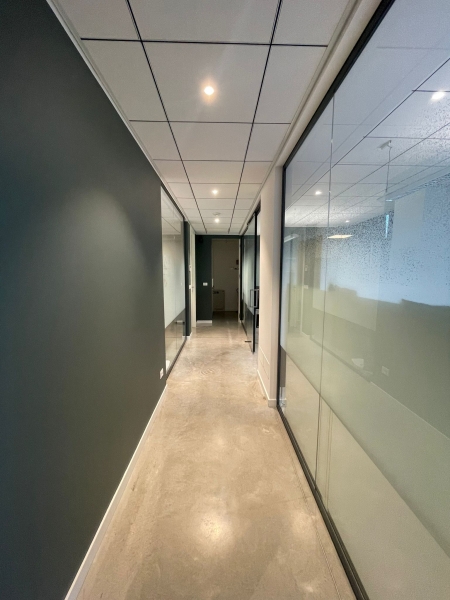 Gli spazi sono organizzati con pareti in vetro, impianto di climatizzazione caldo/freddo, e tende oscuranti.