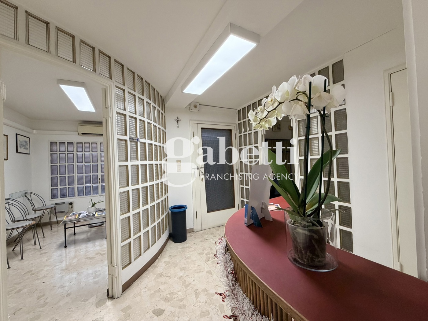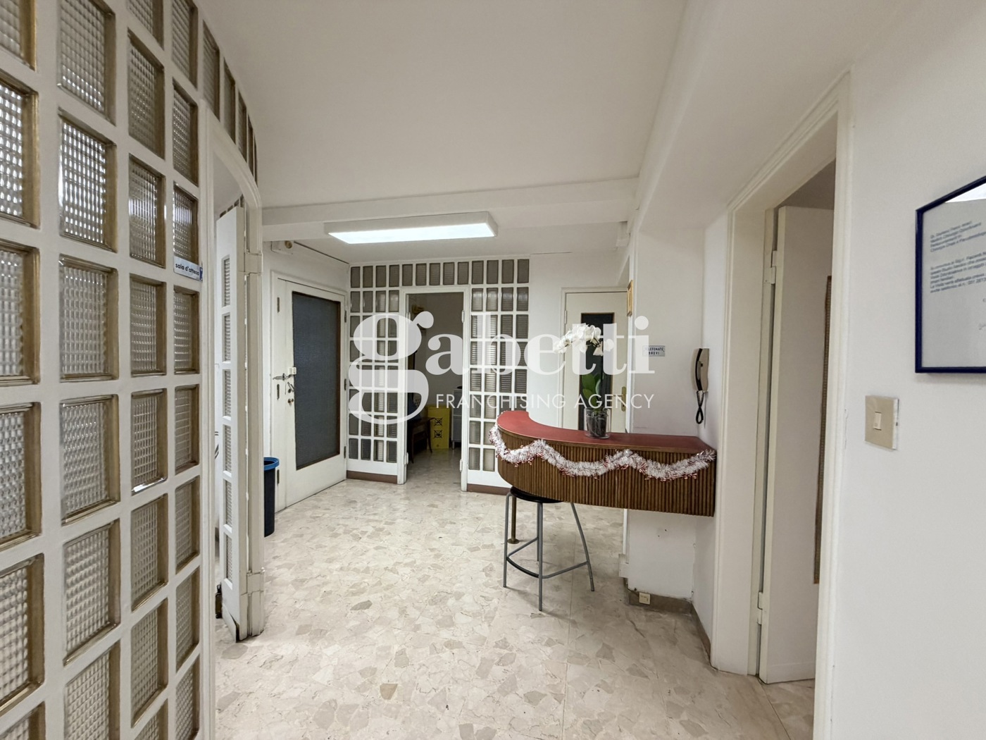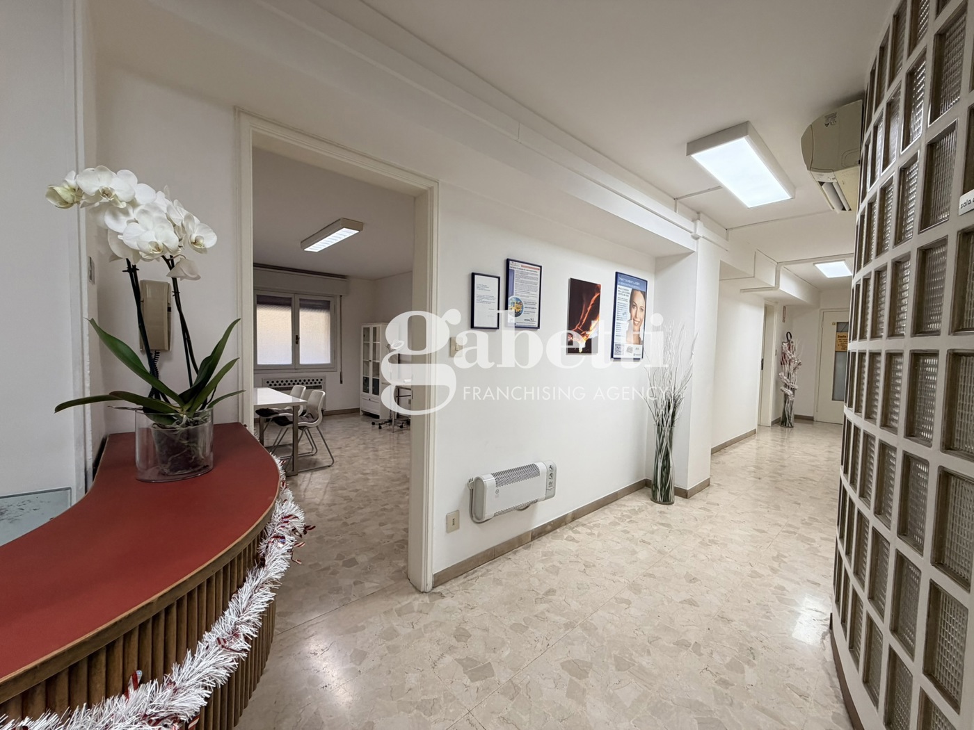 Gli spazi interni sono ben organizzati e comprendono: - Ingresso con area reception - Sala dattesa - Studio / ambulatorio - Locali di servizio Le finiture includono pavimentazione in marmo, pareti chiare, illuminazione a soffitto e divisori in vetrocemento che garantiscono luminosit e riservatezza.