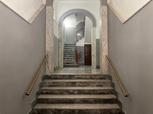 Il primo dei due uffici, di 201 mq, si suddivide in ampio ingresso, dal quale si accede ad un primo vano e attraverso un disimpegno al bagno e all'archivio, in tre altri vani, un ripostiglio e due balconi prospicienti Corso Umberto I; attraverso una scala di pertinenza esclusiva si accede poi al piano terzo/copertura, ove ubicato un ripostiglio.