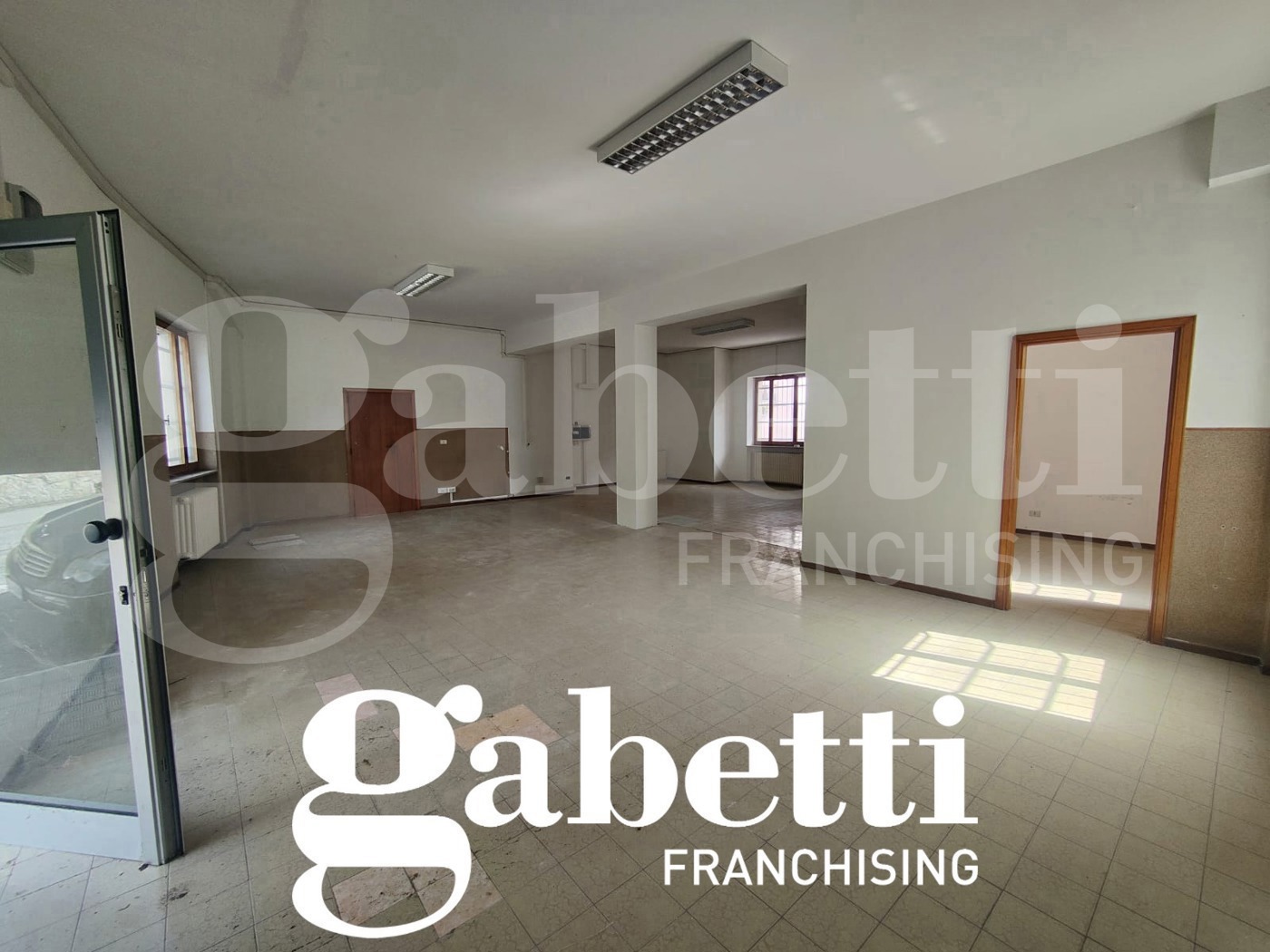 La porzione in esame una ex filiale bancaria disposta su due livelli ripartiti funzionalmente come di seguito: ufficio al piano terra, accessibile direttamente dalla pubblica via, composto da grande vano principale oltre piccolo ufficio e scala interna di collegamento con il sottostante deposito composto da due vani, uno dei quali adibito a servizi igienici.