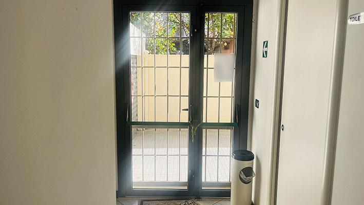 Alla proprietà si accede direttamente dalla via Trieste al civico 5, ma anche dalla corte comune lato sud/est, al civico 7. Le pareti interne sono in tinteggiate di colore bianco, i divisori degli uffici sono in pannelli, alcuni dei quali con porzioni vetrate e intelaiatura metallica di colore nero. La pavimentazione è in piastrelle quadrate di medio formato di colore chiaro; i bagni presentano rivestimenti con piastrelle rosa chiaro quadrate di piccolo formato, i sanitari sono di colore bianco.