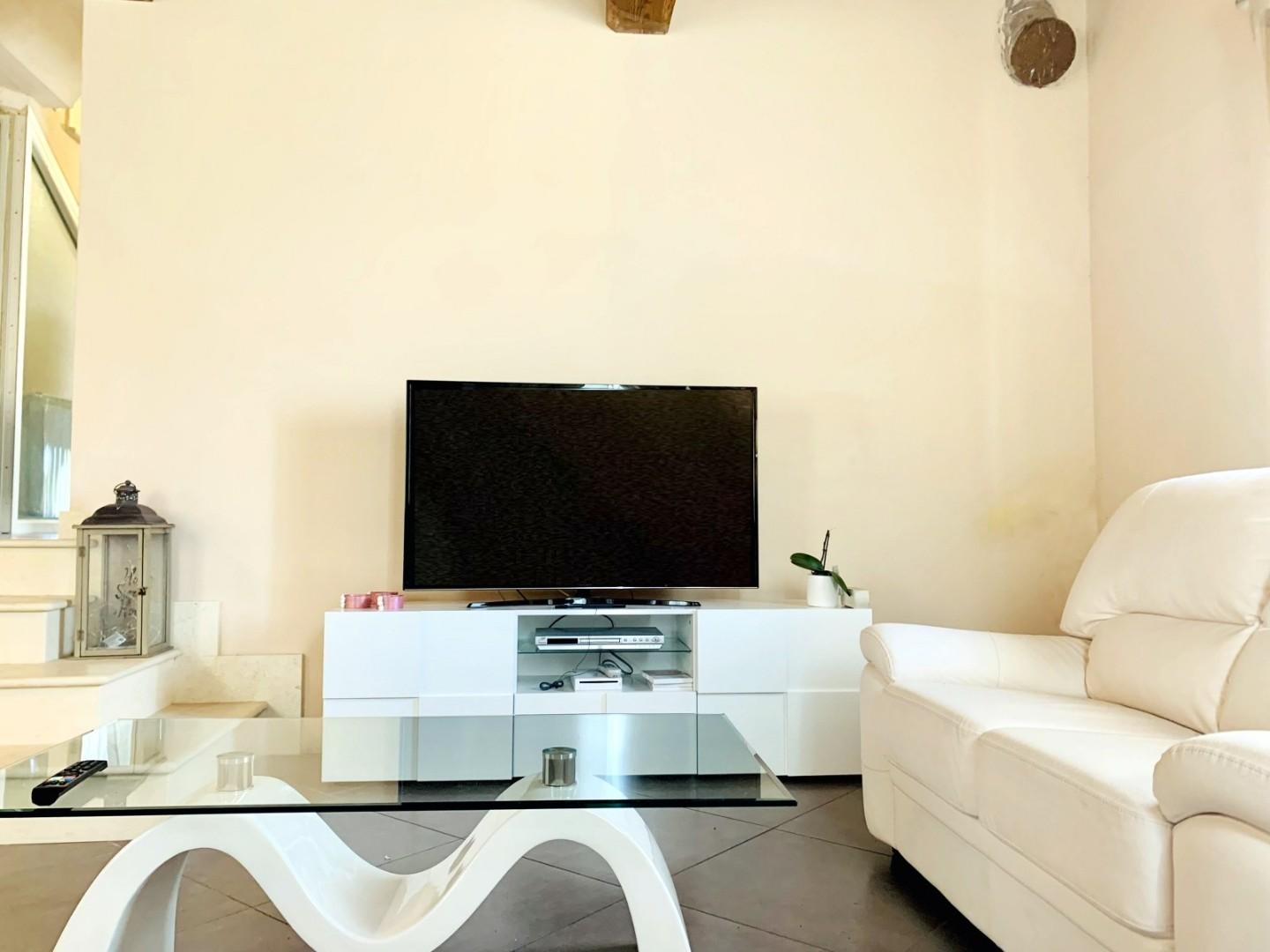 La zona living si compone di un luminoso soggiorno con sala da pranzo e salotto con TV. Sempre a questo livello si trova un vano attualmente occupato da un divano-letto (1 pax), una comoda lavanderia ed un bagno con box doccia.