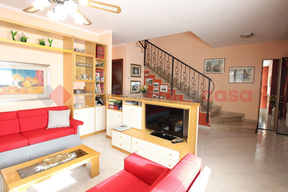 Piano terra con ampio e luminoso soggiorno, cucina abitabile, disimpegno e bagno di servizio, comoda scala che porta al piano primo con camera matrimoniale (con balcone), altre due camere da letto (una con balcone) e bagno.