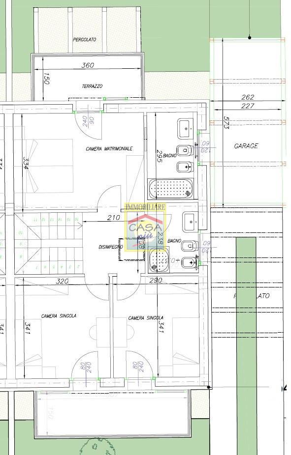 VILLETTA N. 4/5 - Villetta bifamiliare disposta ai piani terra e primo con annesso garage e giardino privato di circa 150 mq, composta da ingresso-soggiorno, cucina abitabile con accesso diretto al giardino, ripostiglio/lavanderia, bagno di servizio con antibagno e ripostiglio sottoscala; scala interna che conduce al piano primo dove si trova il reparto notte composto da disimpegno, una camera matrimoniale con bagno privato e terrazzo, due camere singole entrambe con terrazzo, bagno principale con doccia.