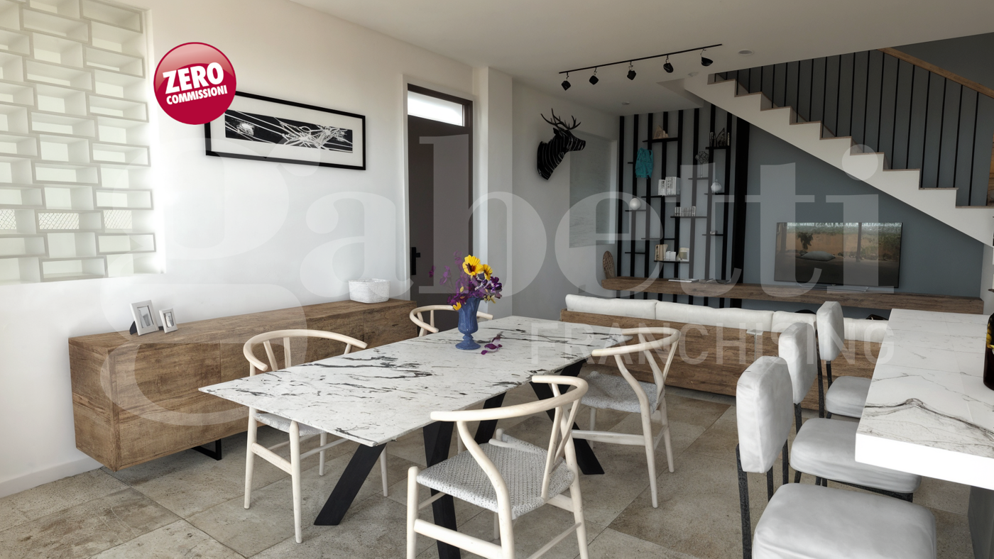 P.T. soggiorno, cucina abitabile, bagno, garage e cantina, portico a doppia altezza.