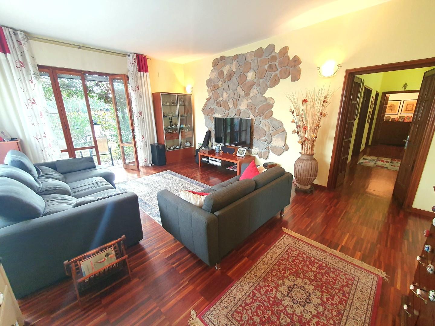 Si compone al piano terra da ingresso nell'ampio e accogliente soggiorno dotato di due ampie vetrate direttamente sul giardino esclusivo, di fianco troviamo la cucina molto spaziosa dotata di una grande e comoda dispensa a scomparsa con ante scorrevoli di legno.