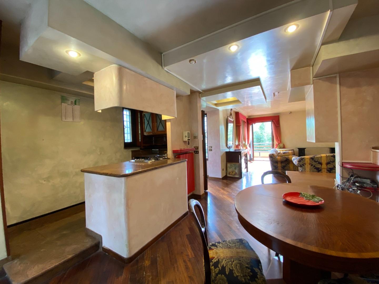 L' immobile è composto al piano terra da ingresso in ampia zona giorno con cucina open space, camera matrimoniale e servizio finestrato; tramite bellissima scala in legno si accede al piano notte dove troviamo altre due camere matrimoniali, bagno, ripostiglio e ampi terrazzi di cui uno molto grande con loggiato.