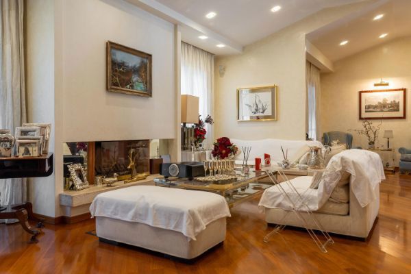La propriet si divide in due unit completamente indipendenti tra di loro. Una prima unit composta da salone doppio, due camere da letto di cui una con cabina armadio, studio con terrazzo, cucina con tinello, tripli servizi e giardino di circa 250 mq con piscina e patio provvisto di cucina esterna.