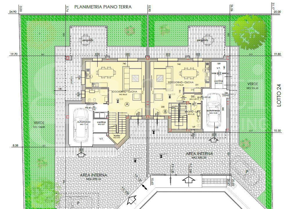 Ogni porzione, circondata da un giardino privato che abbraccia lintera propriet, si sviluppa su circa 150 mq distribuiti su due livelli: al piano terra troviamo un ampio e luminoso soggiorno con angolo cottura e accesso diretto a un pergolato esterno, ideale per godersi momenti allaperto, oltre a un bagno finestrato e vano tecnico lavanderia; il primo piano composto da tre camere da letto, un secondo bagno e pratico ripostiglio o guardaroba.