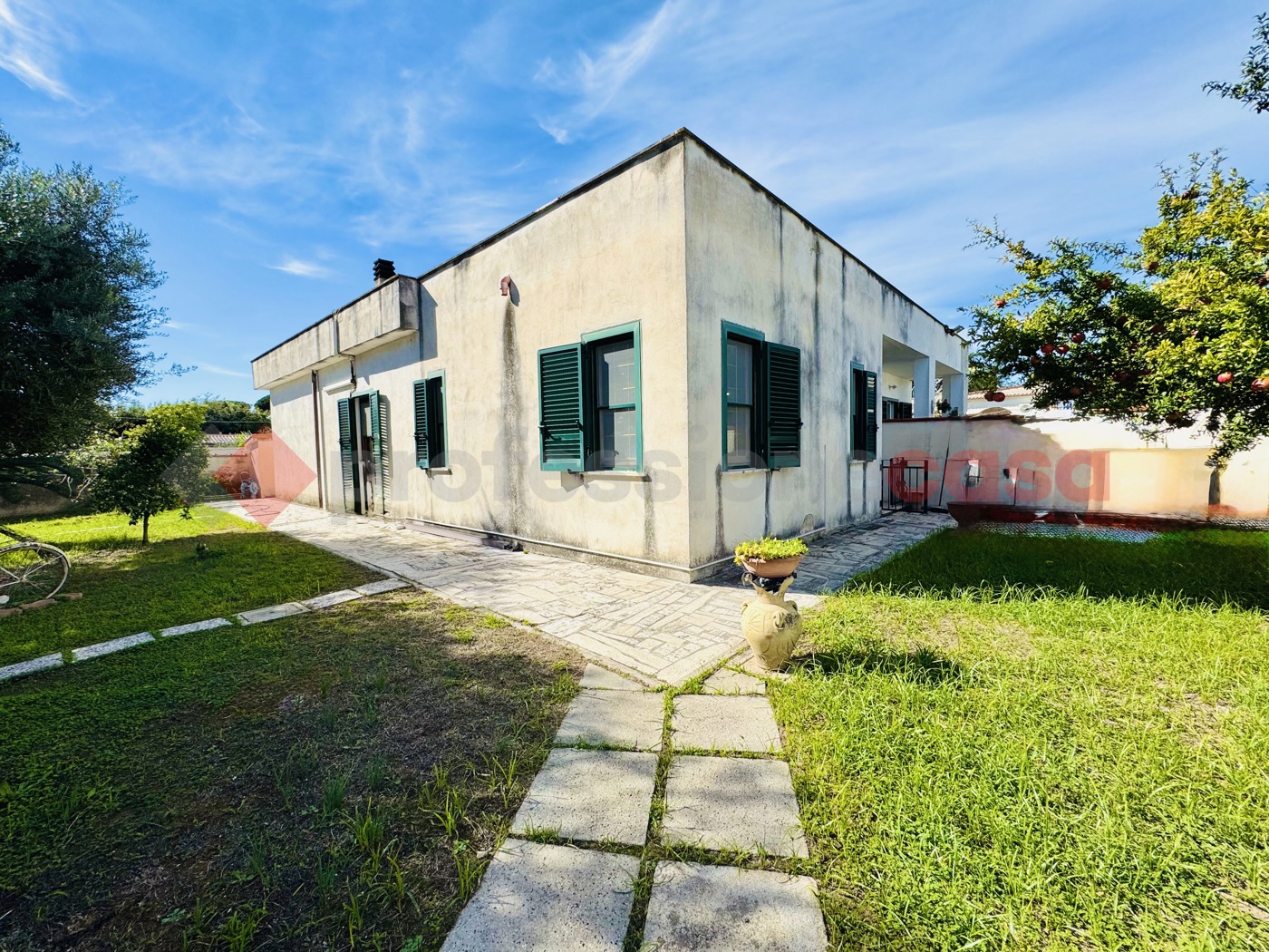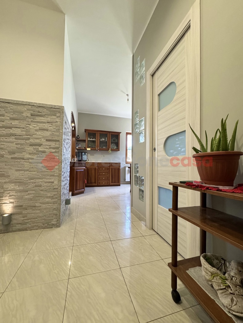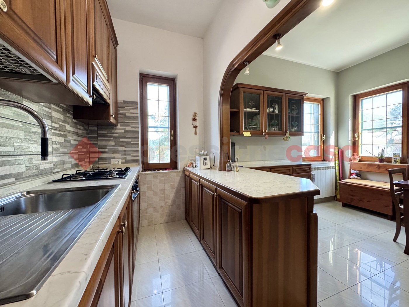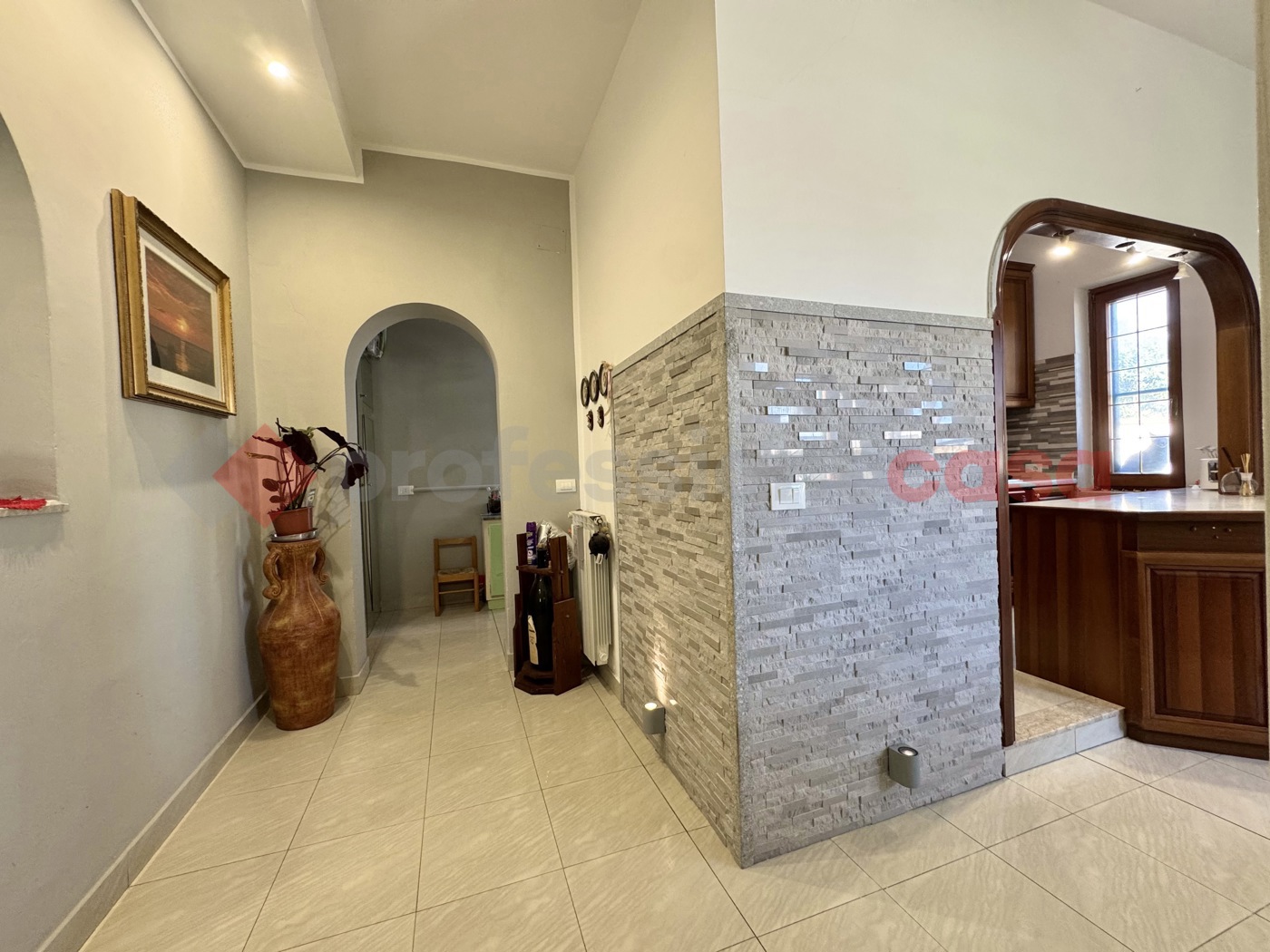 Il giardino che gira sui lati della casa. Un camminamento pavimentato ci conduce verso la villa, dove troviamo la porta che apre nell'ingresso, dove un disimpegno ci conduce sulla destra ad una comoda cucina abitabile e a seguire un comodo ripostiglio mentre frontalmente ci accoglie un ampio salone con termo-camino, per trascorrere momenti di convivialit.