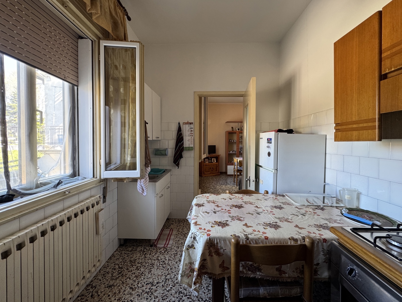Labitazione si sviluppa interamente al primo piano e accoglie con un ingresso che conduce direttamente ad un ampio e luminoso salotto, proseguendo si trova la cucina, separata e abitabile, che offre uno spazio pratico e ben organizzato.