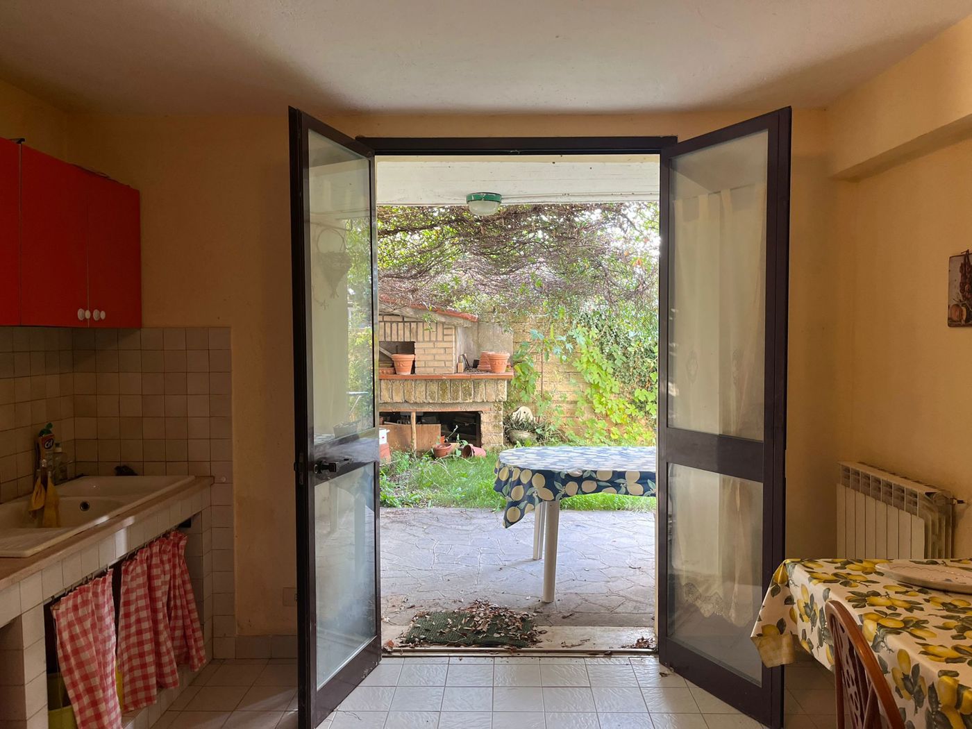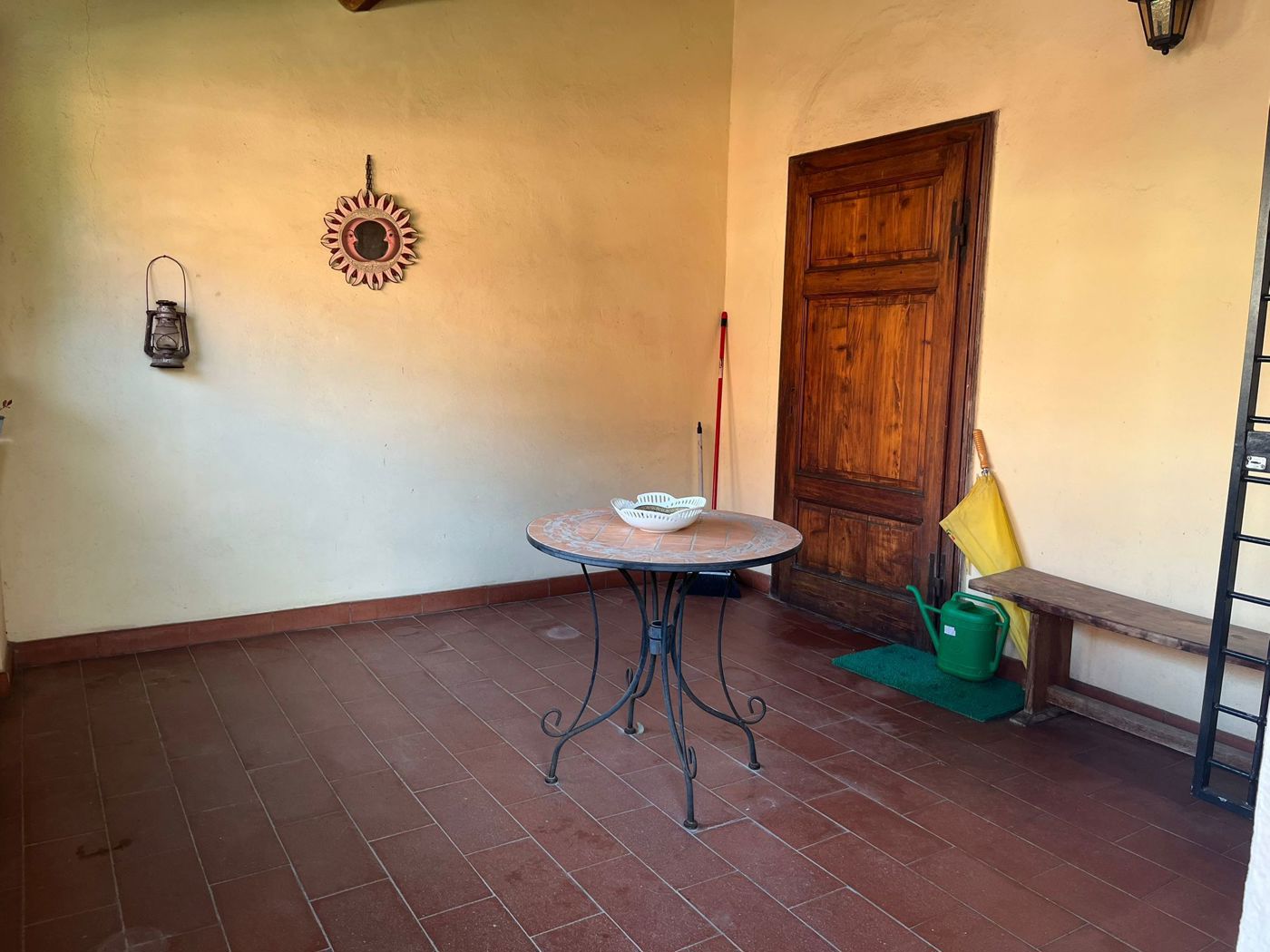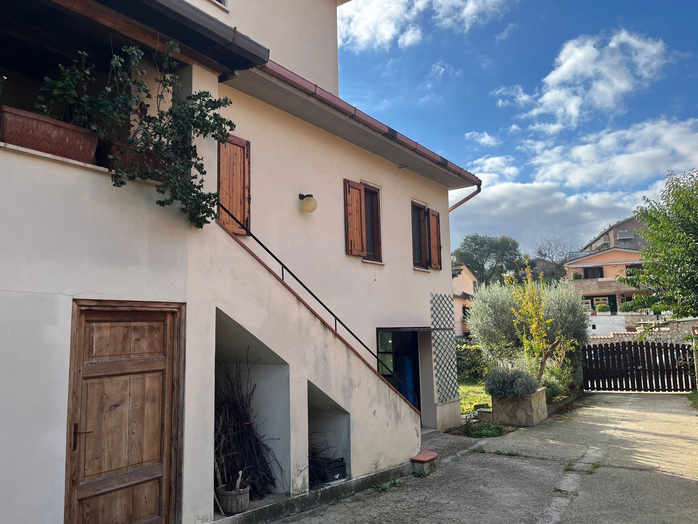 Superato l'ingresso si percorre un vialetto comune che conduce alle scale esterne per raggiungere il piano primo.