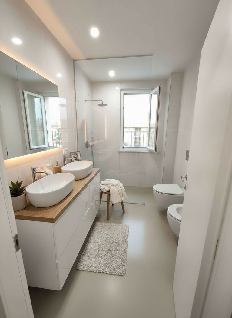 Un disimpegno conduce al bagno di servizio, finestrato e dotato di una grande apertura che ne esalta la luminosit.