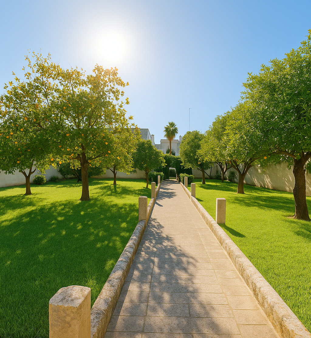 Varcando il cancello, ci si ritrova in un piccolo mondo privato: un grande giardino, un frutteto e un agrumeto, spazi ampi che evocano la libertà di vivere allaperto, tra profumi mediterranei e silenzi interrotti solo dal canto degli uccelli.