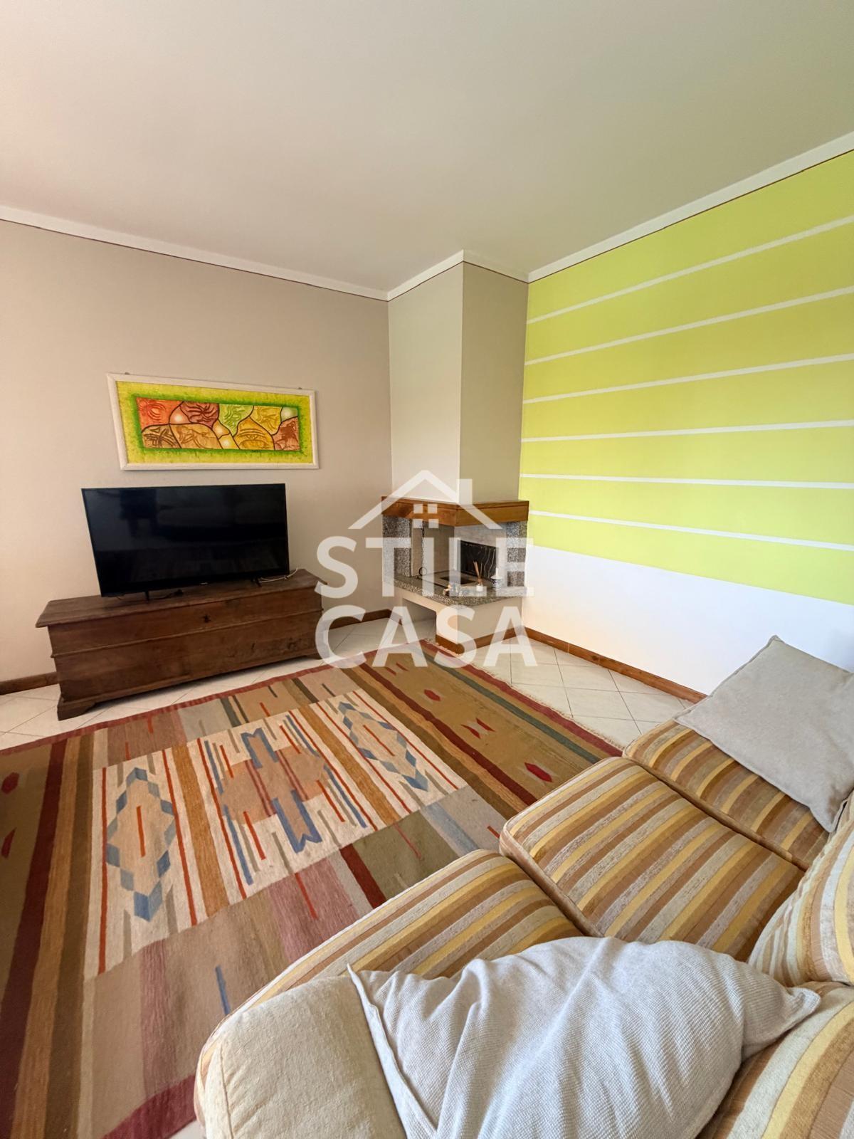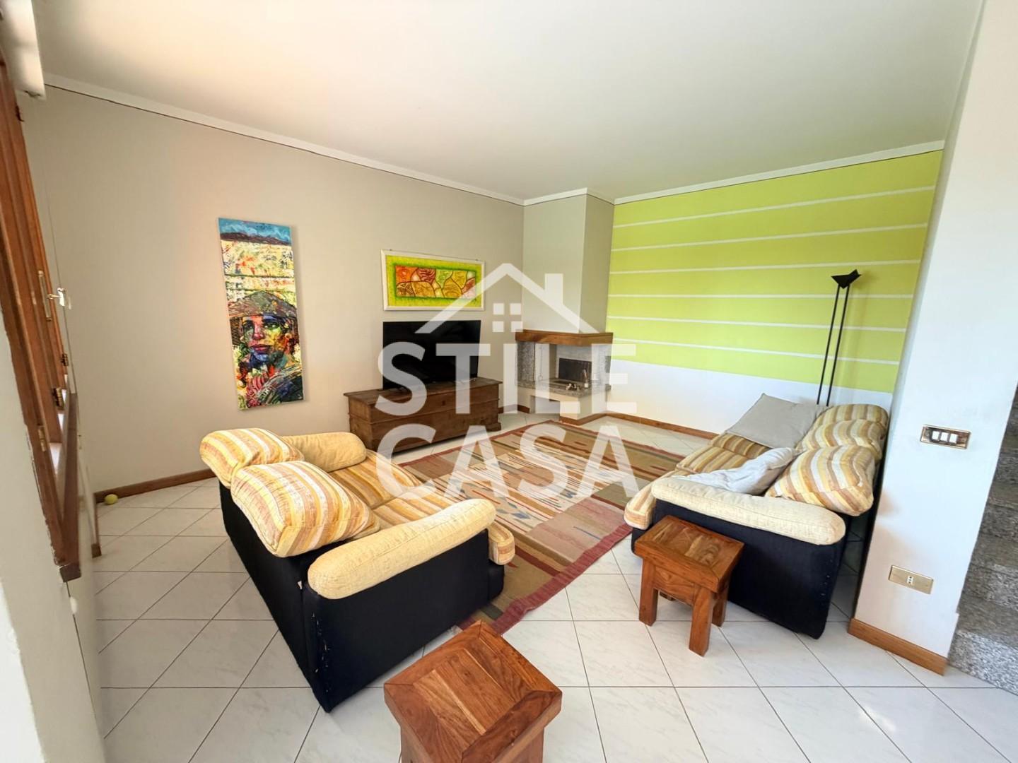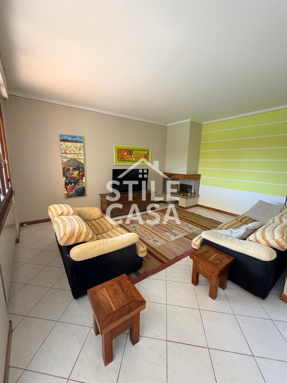 Al piano terra l'ingresso si apre su un ampio soggiorno luminoso con grandi finestre e camino, e collegato in soluzione open space alla sala da pranzo; quest'ultima a sua volta connessa alla cucina abitabile tramite un'apertura ad arco che garantisce continuità tra gli ambienti mantenendo una separazione funzionale.