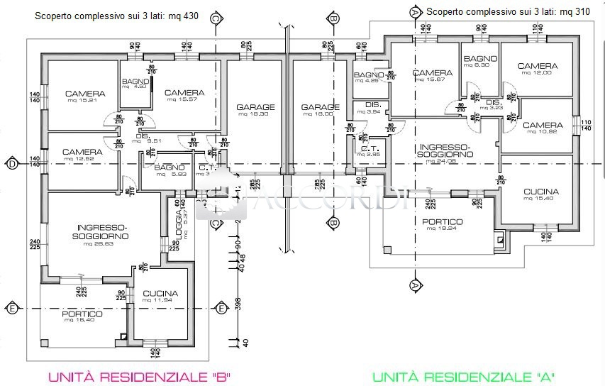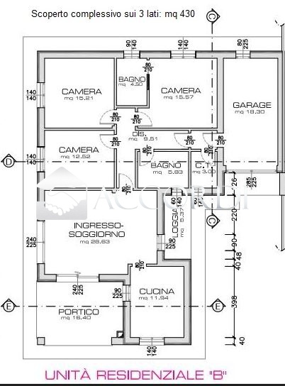 Qui illustriamo l'unita B (leggermente più grande dell'unità A): ci accoglie con un ampio portico di oltre 16mq che conduce all'ingresso e grande open space (soggiorno+living) con loggia esterna abitabile, cucina separata; 3 camere (2 matrimoniali da 15mq + 1 singola da 12mq), 2 bagni finestrati, centrale termica.