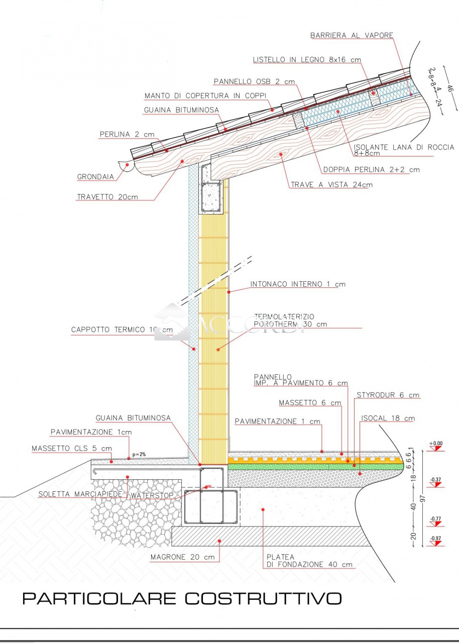 Entrambe le unità sono isolate con termolaterizio da 30cm e cappotto termico da 10cm; copertura in legno a vista e coppi tradizionali.