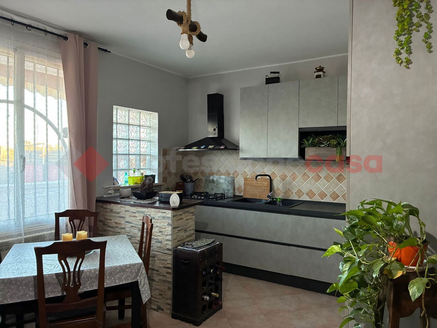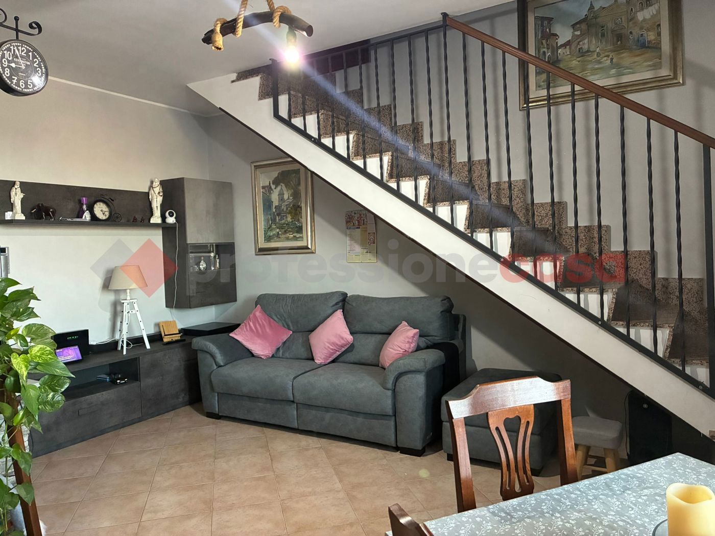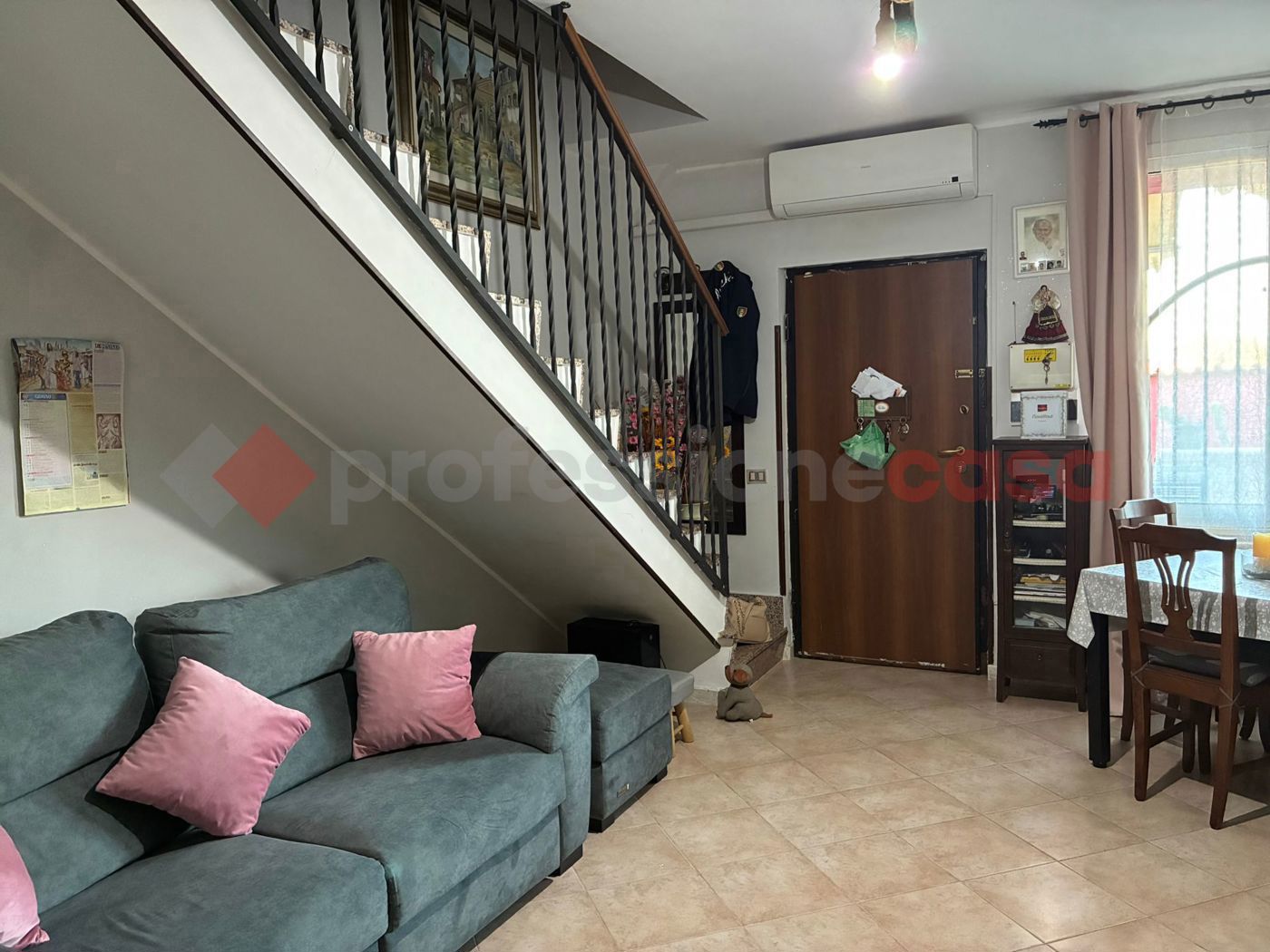 Nuova California - Villa quadrifamiliare bilivello: soggiorno con cucina a vista, tre camere, disimpegno, doppi servizi e balcone.