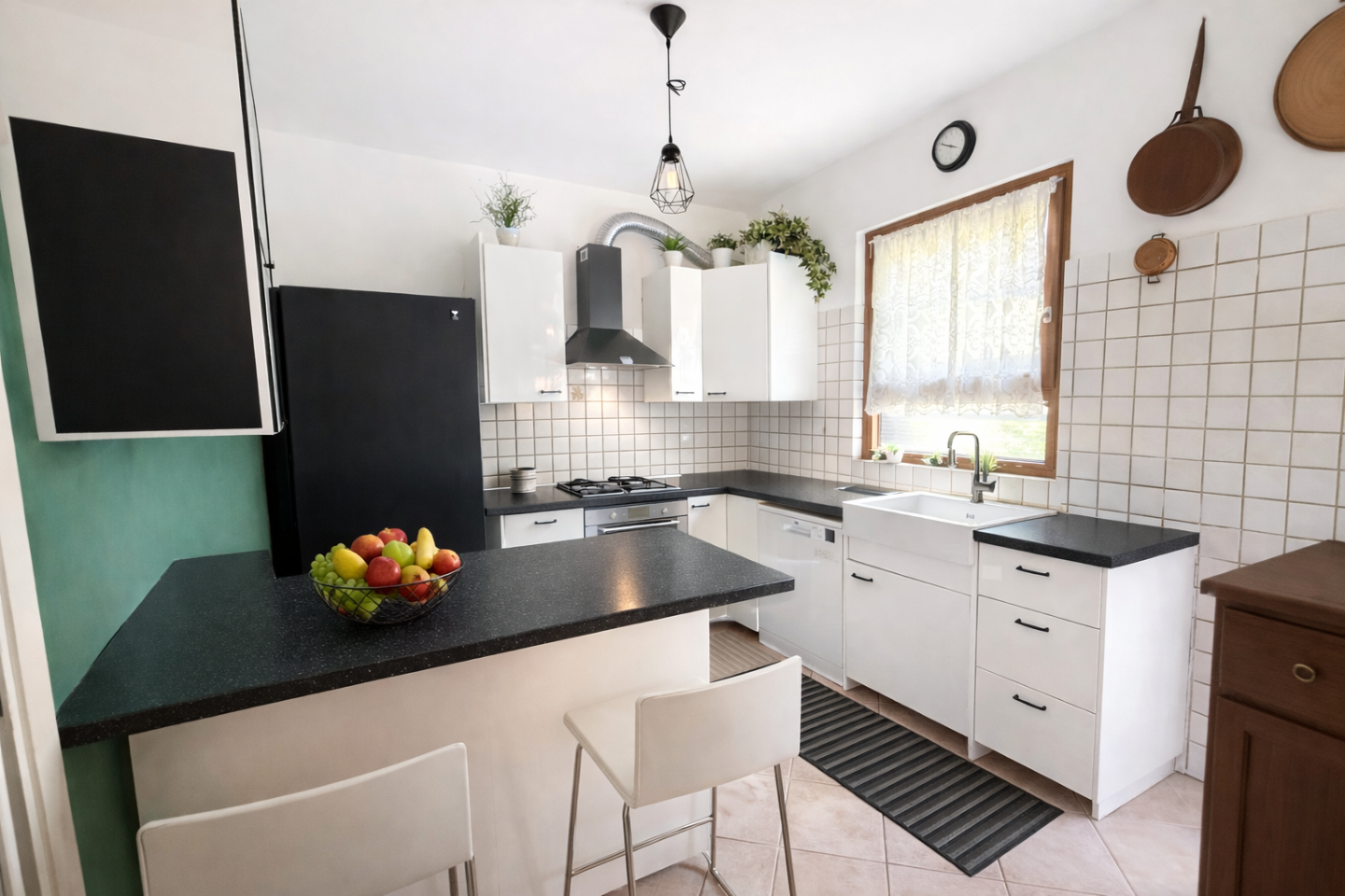 La cucina abitabile, funzionale e spaziosa, completa la zona giorno insieme al bagno di servizio e al pratico ripostiglio.
