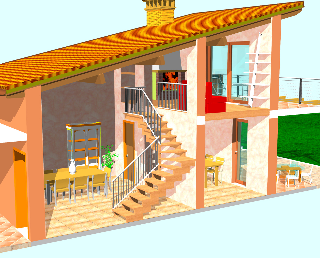 Al piano superiore: >> soggiorno con camino e terrazzo panoramico al quale si accede attraverso unampia vetrata.