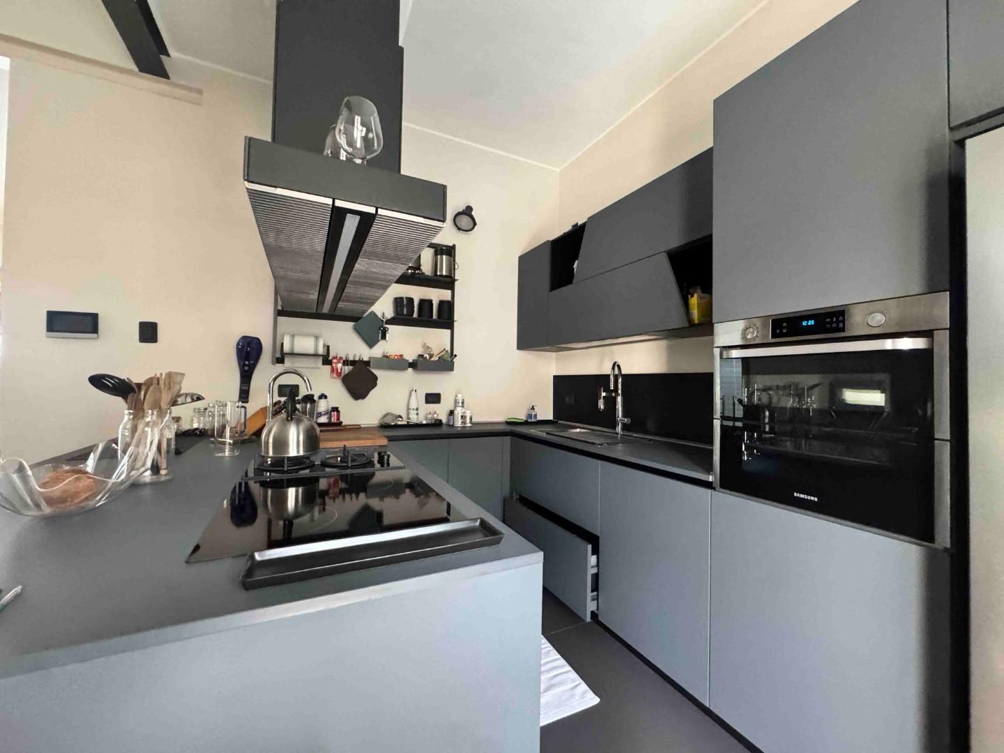 Ingresso, bellissima cucina su misura, un salottino soppalcato con studio, sala pranzo, un disimpegno che divide la zona giorno dalla zona notte dove abbiamo due camere matrimoniali e due bagni.