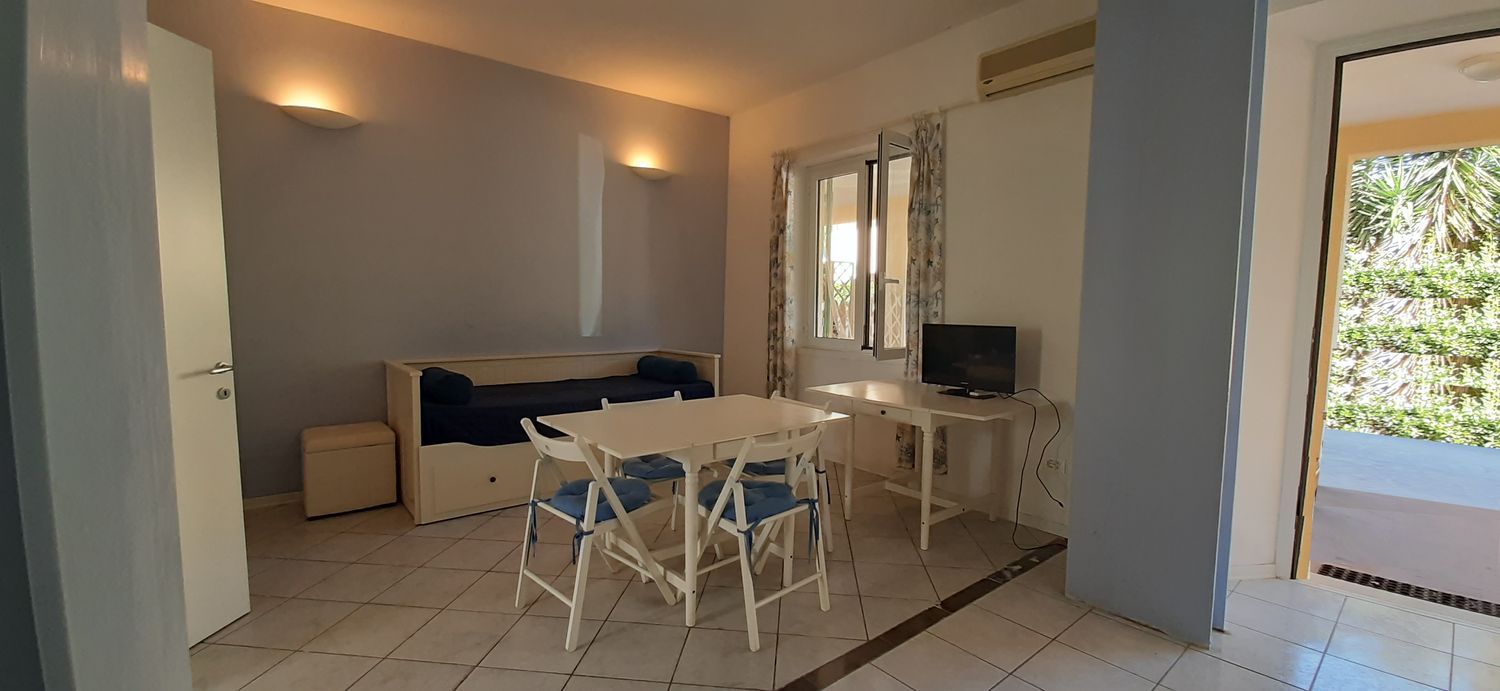 Piano Terra: Zona giorno con angolo cottura e accesso diretto allo spazio esterno sul retro, oltre a un pratico bagno di servizio con doccia.