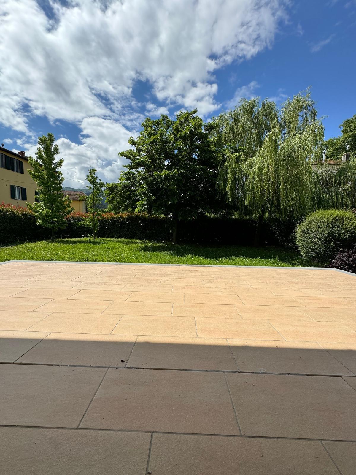 Il giardino privato e recintato di circa 800 mq, distribuito sui quattro lati, è curato e piantumato, con un'ampia zona lastricata per il parcheggio e le manovre, su due livelli per una migliore organizzazione degli spazi.