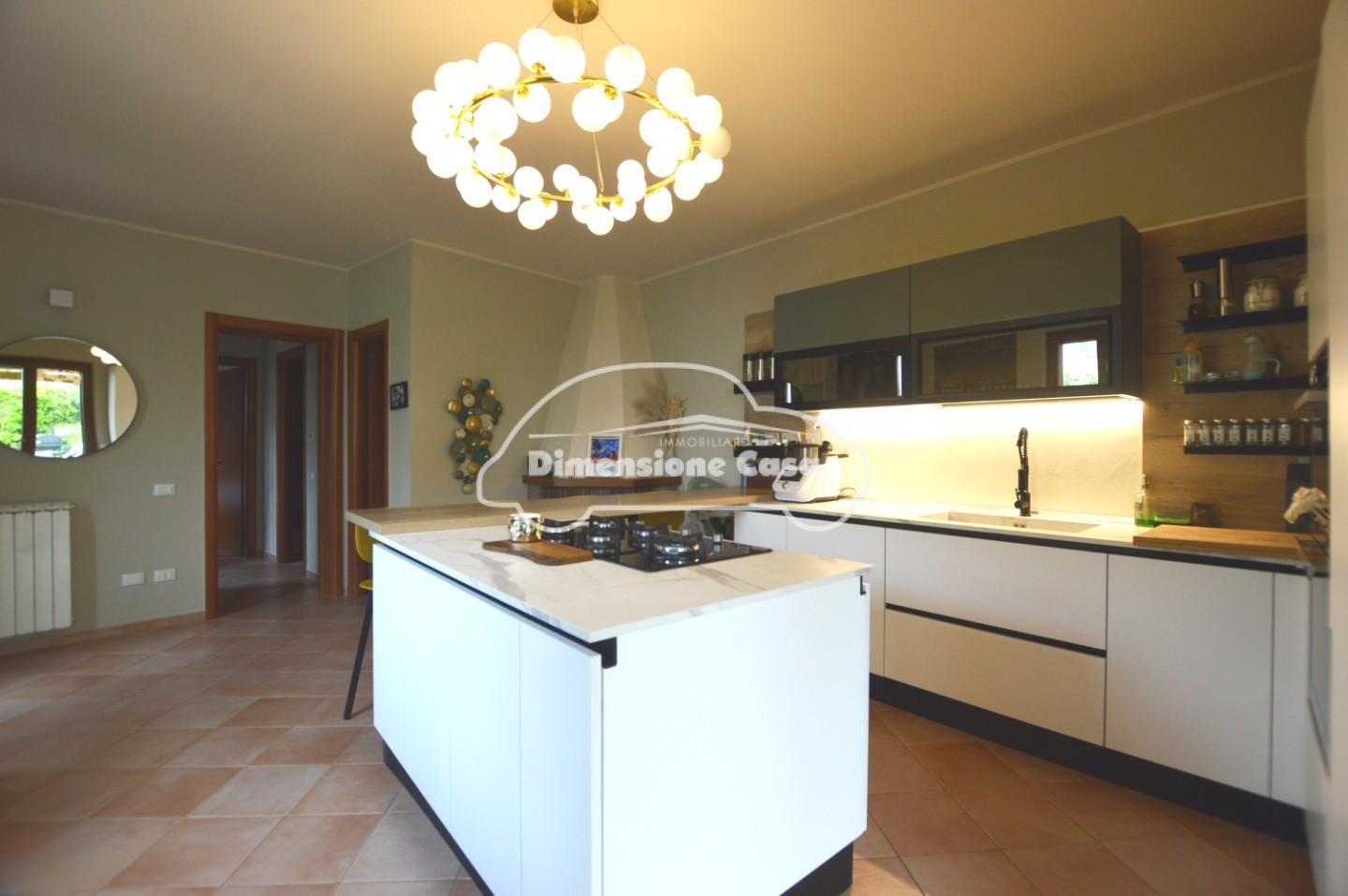 Labitazione si apre su un luminoso soggiorno-pranzo con angolo cottura e camino, proseguendo con disimpegno, camera matrimoniale con stanza armadi, camera doppia e bagno.
