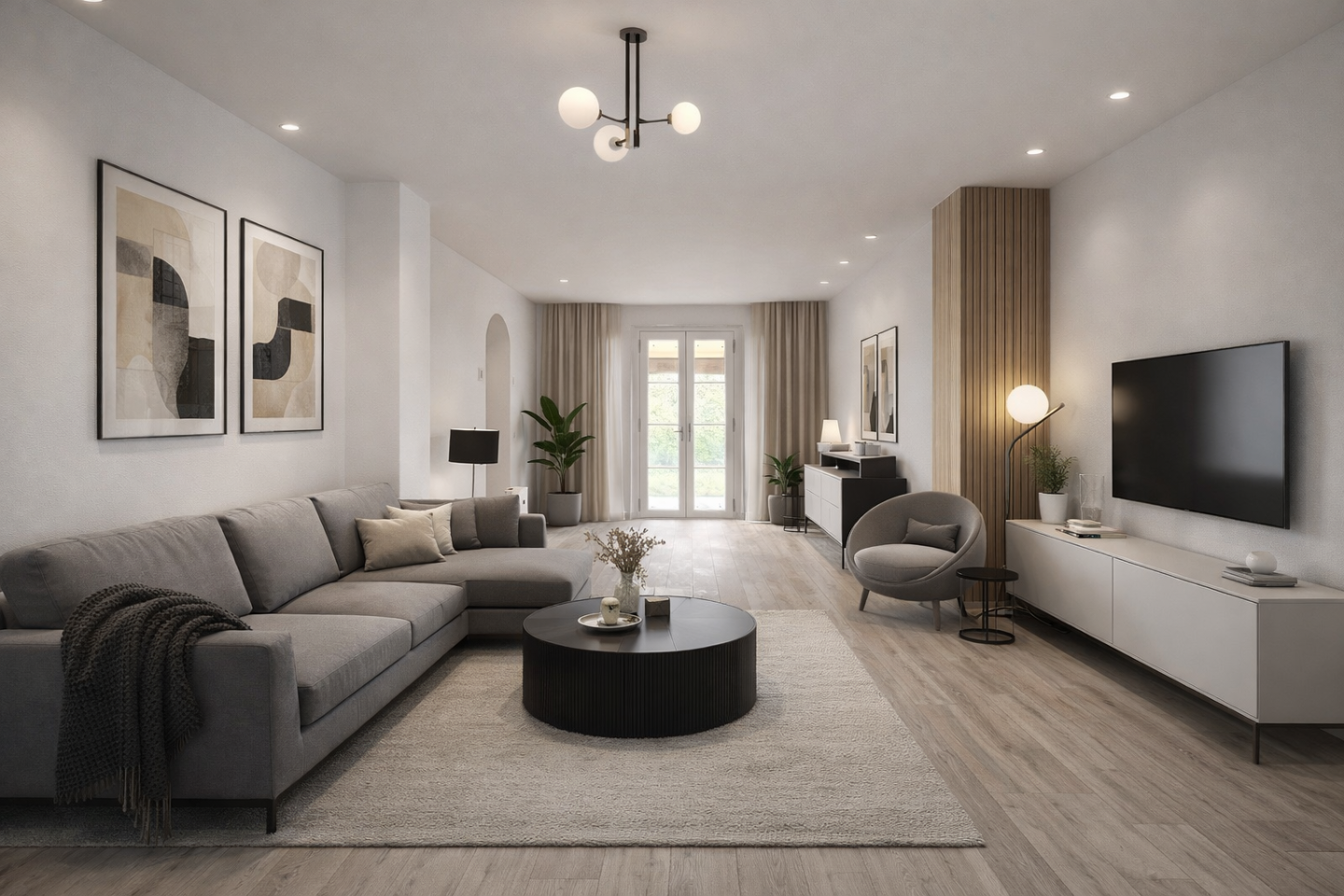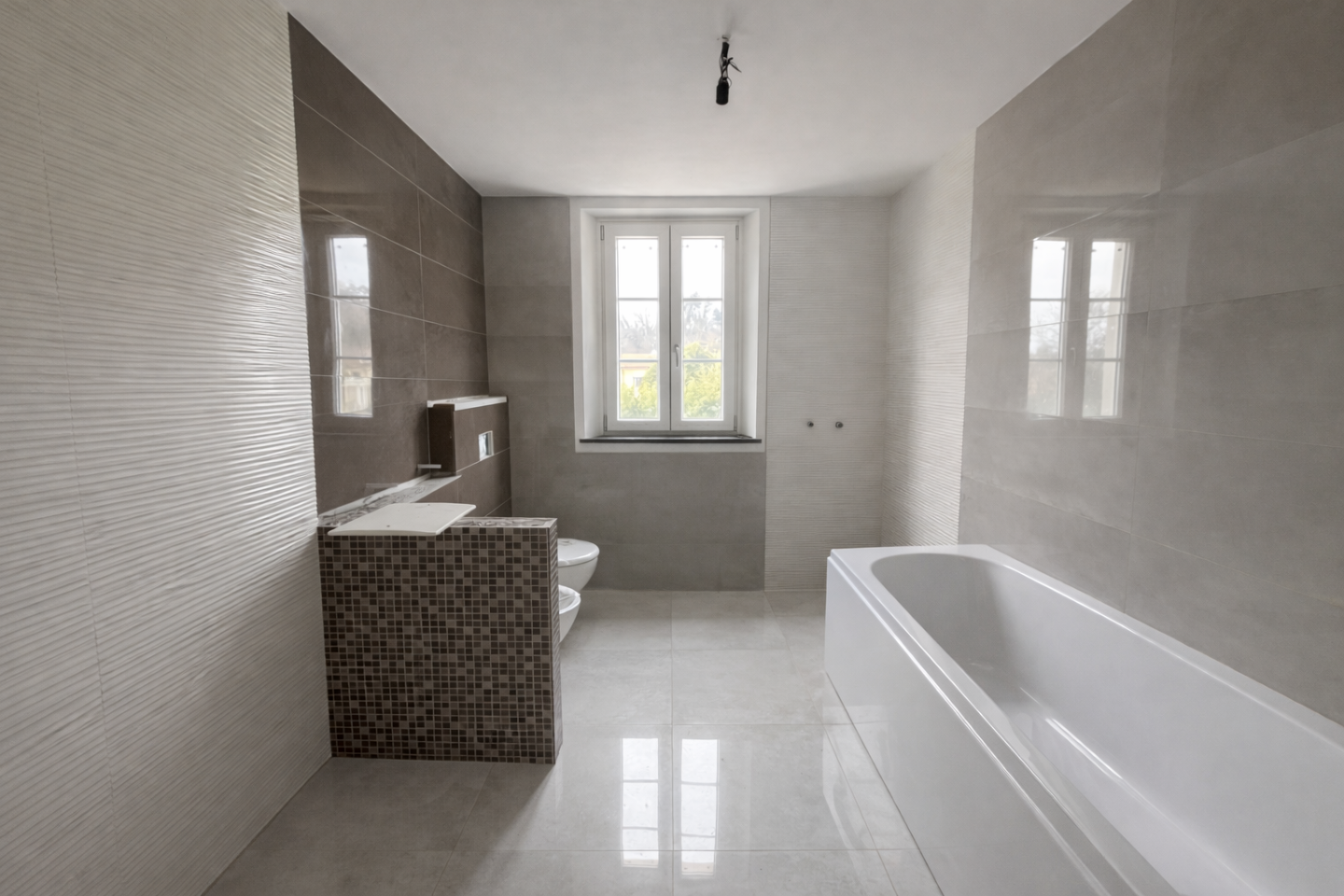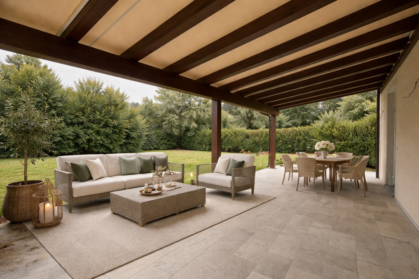 Il piano seminterrato ospita un ampio salone con predisposizione per cucina, perfetto come taverna o seconda zona living, con accesso diretto al giardino tramite pergolato, oltre a bagno con doccia, ripostiglio, locale caldaia e ulteriore spazio esterno coperto.