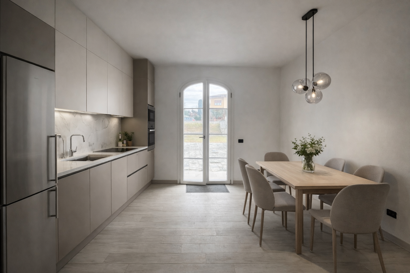 Al piano terra, lingresso conduce a una elegante zona giorno con sala predisposta per camino e accesso diretto a un pergolato affacciato sul giardino, ideale per vivere lesterno in totale riservatezza; completano il piano una cucina abitabile e un comodo ripostiglio.