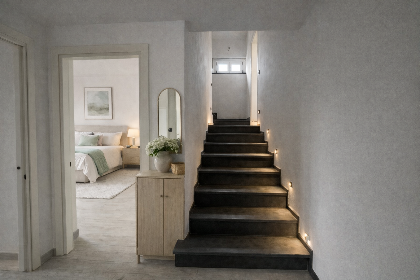 Il piano primo accoglie due camere matrimoniali e un bagno completo con vasca e doccia, mentre il piano primo rialzato è dedicato a una camera matrimoniale con bagno privato e terrazza, ideale come suite padronale o zona ospiti.