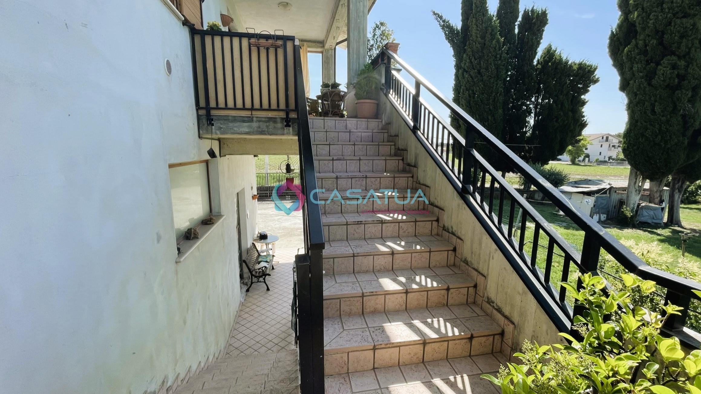 Salendo al primo piano, tramite una scala esterna, troviamo una gradevole entrata, coperta da portico che conduce a un ingresso ampio e luminoso.